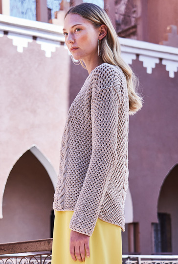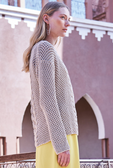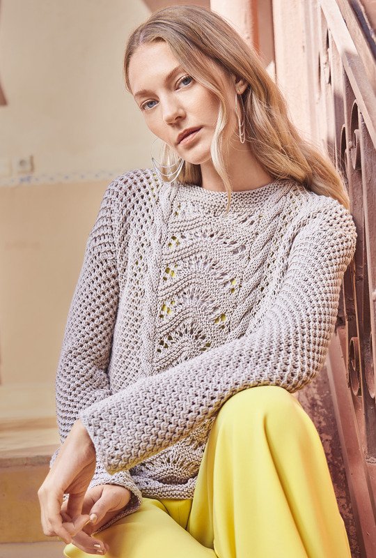Dieser Frühjahrspulli bietet alles, was das Strickerherz begehrt: Einen zeitlosen, lässigen Schnitt, ein weiches, angenehm kühles Baumwollgarn und ganz viel Kreativität und Strickspaß! Gestrickt wird der Pullover in vier Teilen. Direkt nach der Anschlagsreihe beginnt auch schon der Musterspaß – ein feines, luftiges Lochmuster bildet das Netz, welches von der Wirkung her unaufdringlich genug ist, um den Blick nicht zu sehr von den mittleren Mustern abzulenken. Diese bestehen aus zwei schmalen Zöpfen, welche einen schönen Rahmen für das mittige Pfauenmuster bilden. Die Ärmel werden dann ganz aus feinem Mesh gestrickt. Die unterschiedlichen Muster sind nicht schwer zu stricken und die übersichtlichen Strickschriften helfen hier stets den Überblick zu behalten. Hilfreich ist es auch, die unterschiedlichen Muster mit Maschenmarkierern zu kennzeichnen. Sind alle Teile fertig gestrickt, werden im Anschluss alle Nähte geschlossen und der Halsausschnitt erhält noch die kraus rechts gestrickte Blende.