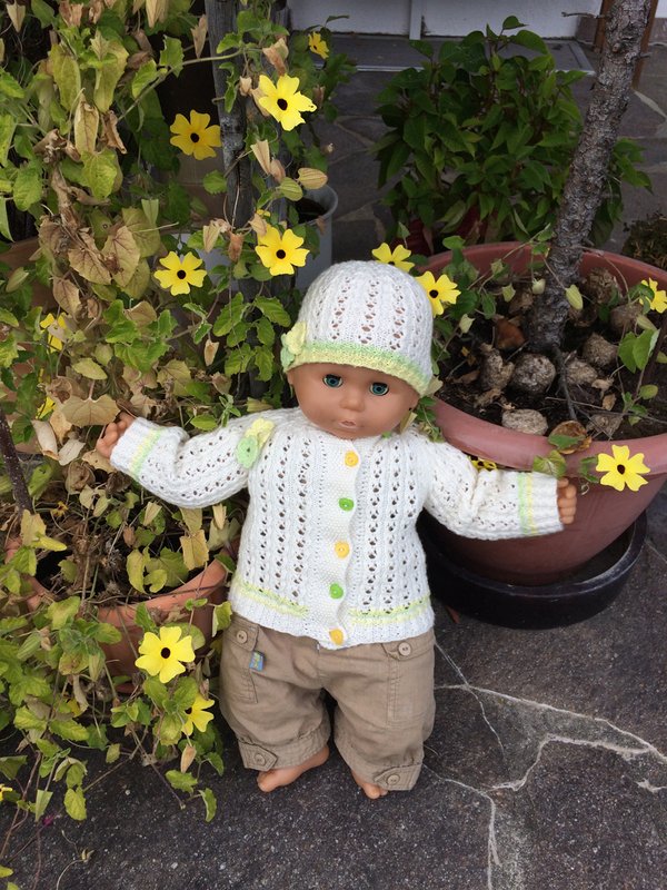 Jäckchen und Mützchen passen einem Baby von drei bis circa sechs Monaten.