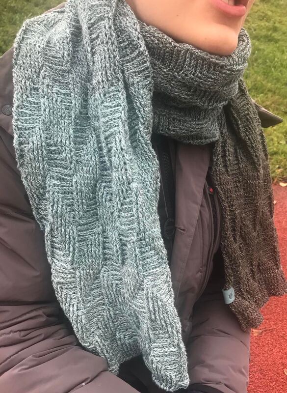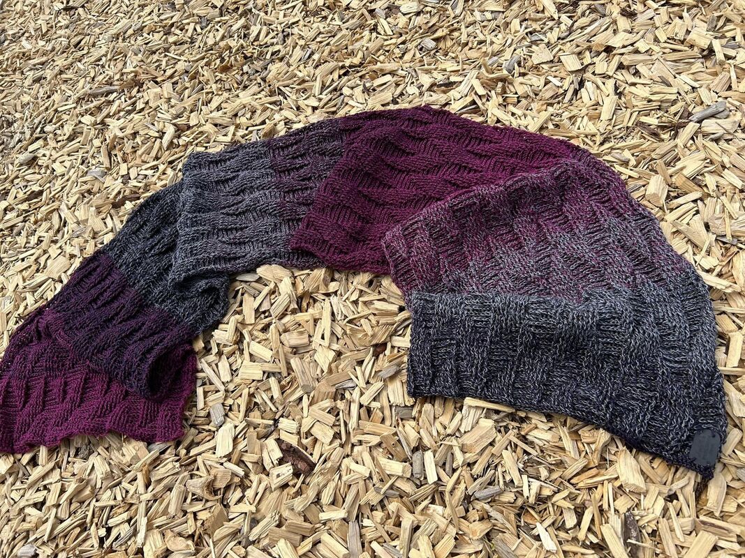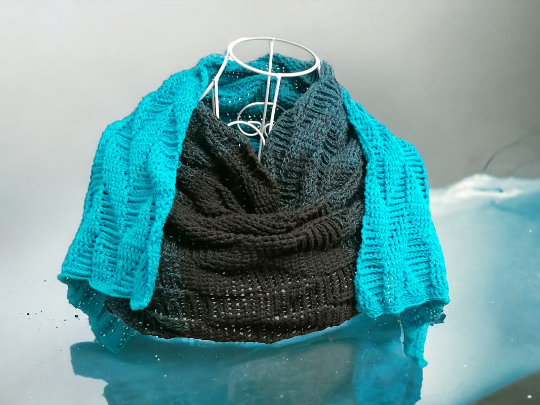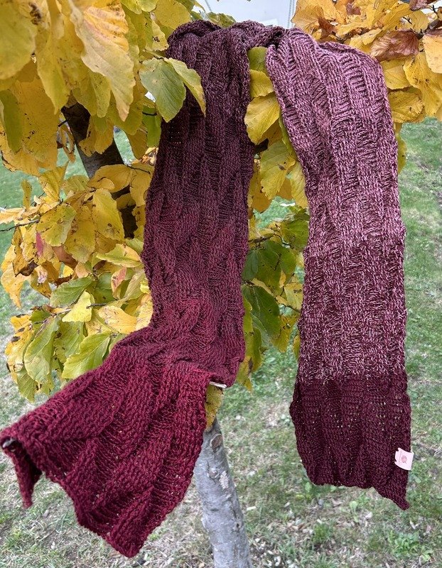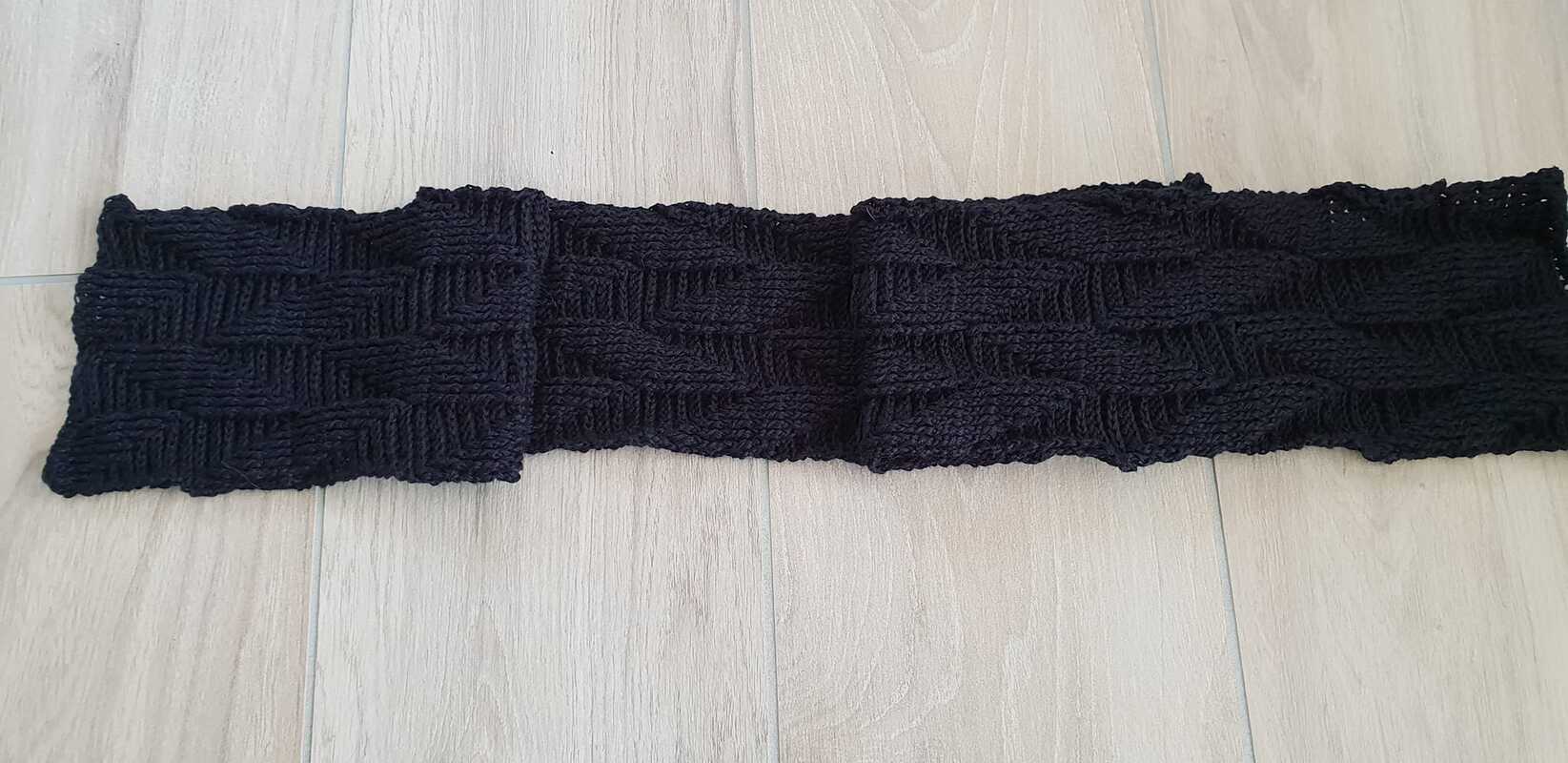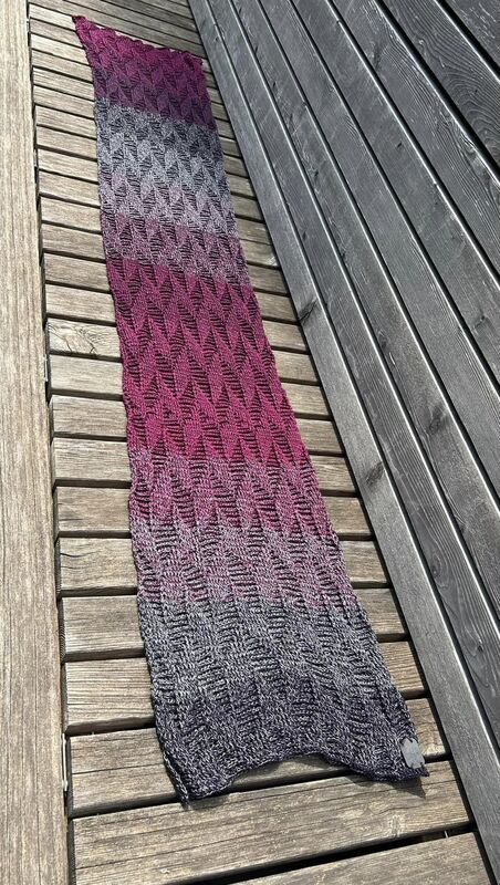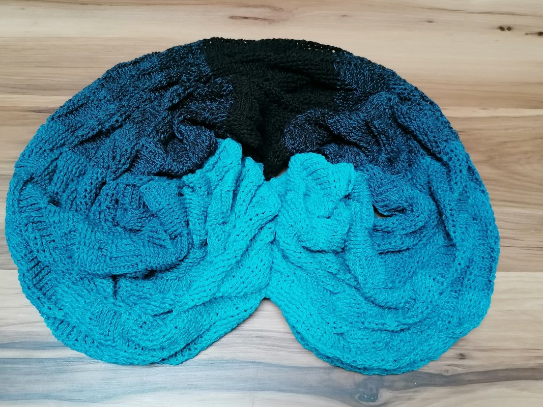 Der auf den Fotos abgebildete Schal ist etwa 35 cm breit (= 5 Mustersätze) und 160 cm lang. Ich habe 2 Bobbel genommen, allerdings vom zweiten den reinen schwarzen Teil abgewickelt, damit der schwarze Teil in der Mitte des Schals nicht zu dominant wird. Insgesamt habe ich etwa 1400 m verhäkelt. Den ersten Bobbel habe ich von der Mitte aus begonnen, den zweiten von außen.