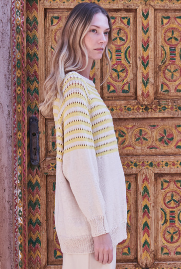 Dieser Baumwollpulli macht gleich mehrfach gute Laune! Erst einmal natürlich, weil er so frühlingshaft daherkommt. Dann, weil sich die reine Baumwolle einfach ganz wunderbar trägt – da ist es nur gut, dass der Pulli zu fast allem passt, so kann man ihn auch ganz oft tragen. Und obendrauf strickt er sich ohne Nähte ganz unkompliziert und schnell. So werden Vorder- und Rückenteil gemeinsam angeschlagen und nach dem Rippenbündchen geht es erst einmal mit rechten Maschen immer im Kreis. Auf Höhe der Armausschnitte legen wir unsere Arbeit erst einmal zur Seite und stricken die Ärmel – auch die ganz einfach immer in Runden. Danach werden Körper und Ärmel zusammengefügt und die Passe in der Muster- und Streifenfolge gestrickt. Zum Schluss wird dann noch der Halsausschnitt mit Hilfe verkürzter Reihen geformt und die Blende gearbeitet. Fertig ist der neue Lieblingspulli!