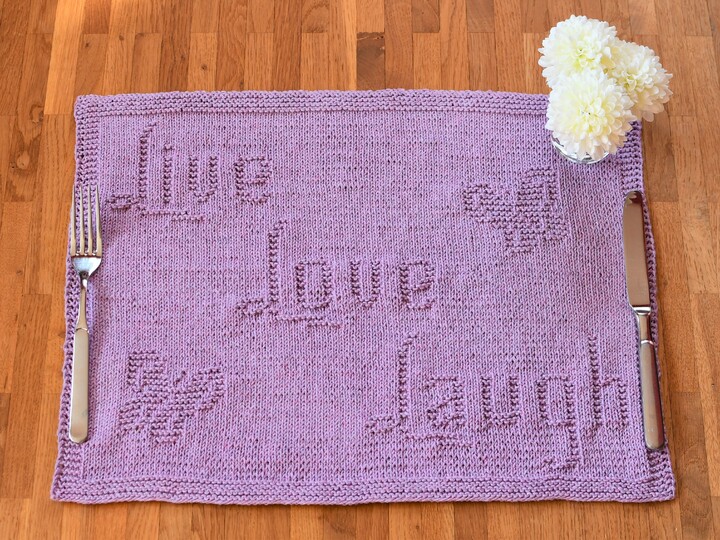 Schlicht und doch etwas ganz Besonderes ist dieses Tischset «Live Love Laugh». Die Aufschrift erinnert daran, was wichtig im Leben ist. Wenn Du das Set in den passenden Farben zu Deinem Geschirr oder Deiner Einrichtung strickst, hast Du damit eine wunderschöne Tischdekoration, die gute Laune macht. Das Stricken geht ganz einfach, nur mit rechten und linken Maschen.