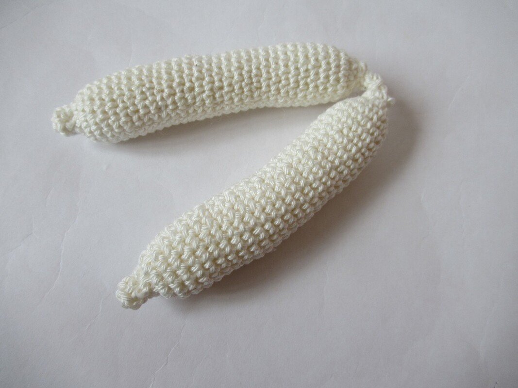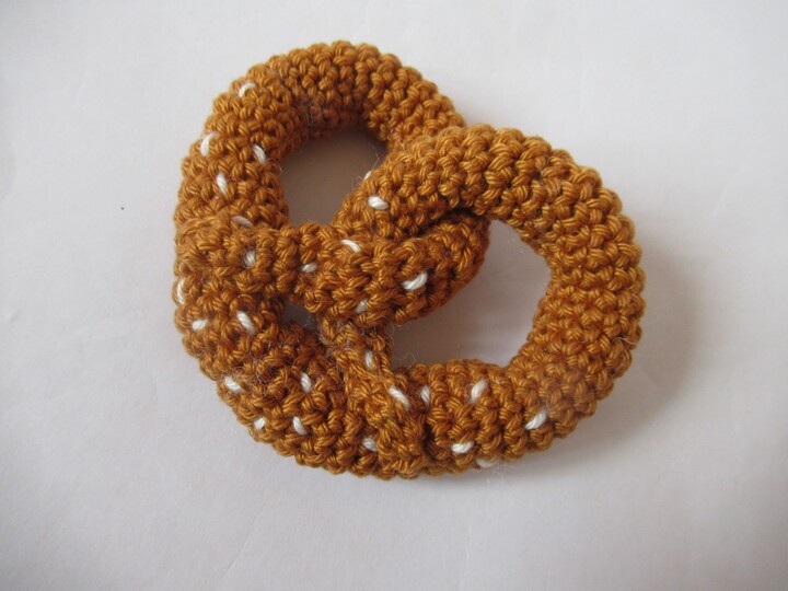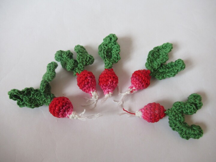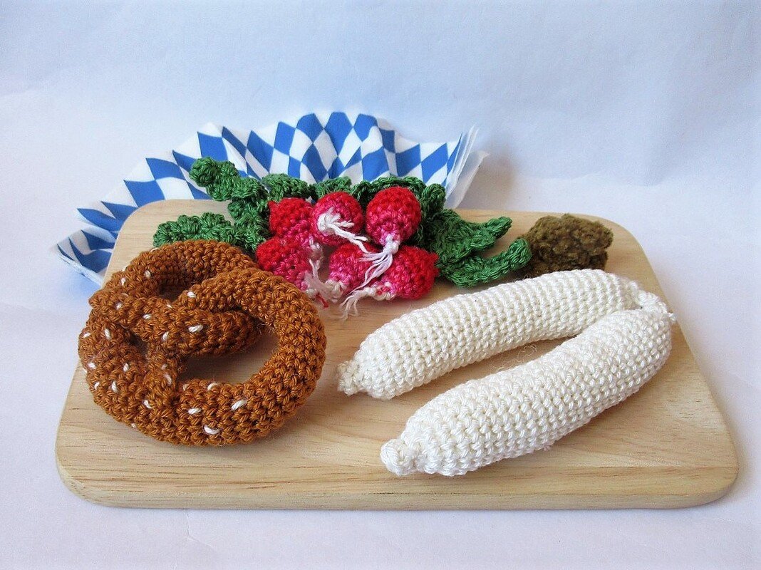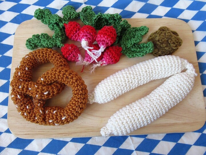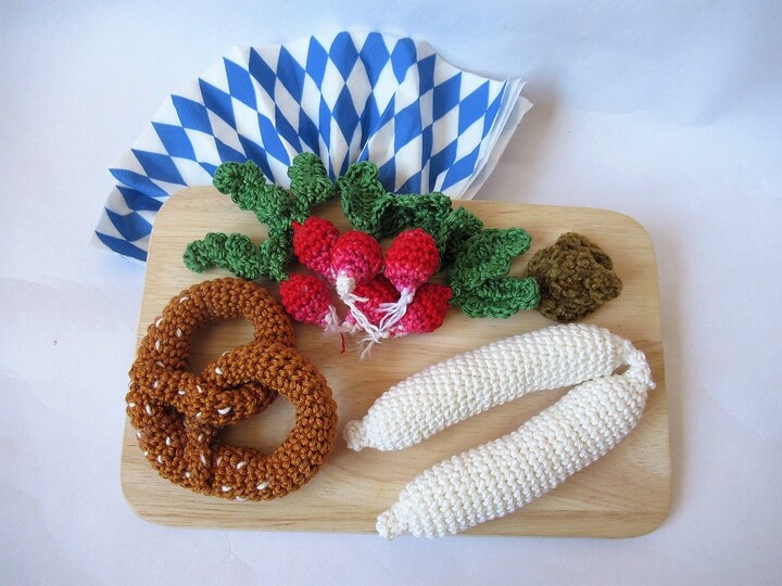 Die Größe der Lebensmittel hängt von der verwendeten Wolle ab. Mit dem vorgeschlagenen Garn werden sie nur ein wenig kleiner als in der Realität. Die Würste werden ca. 10 cm lang, die Breze, 10 cm breit und die Radieschen haben einen Durchmesser von etwa 2 cm.