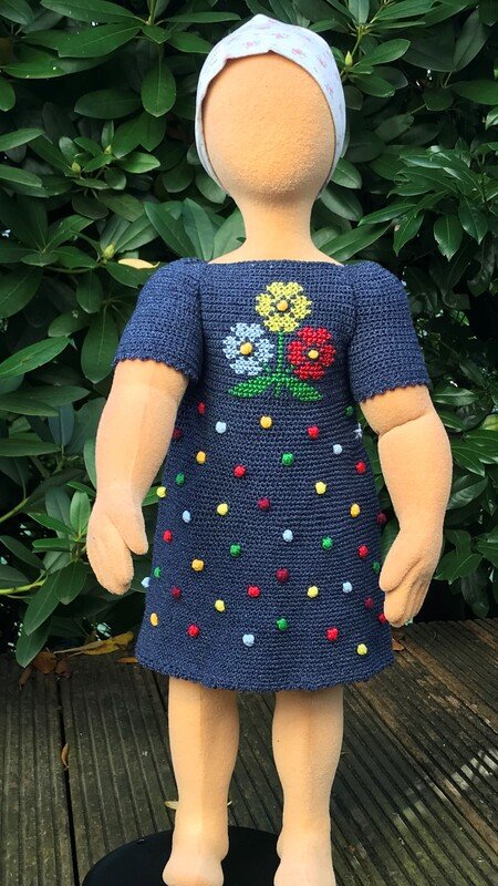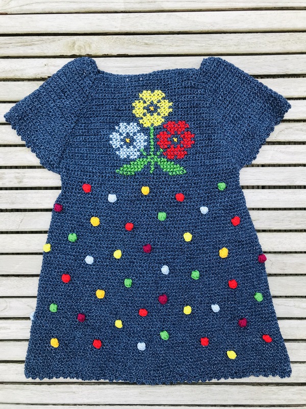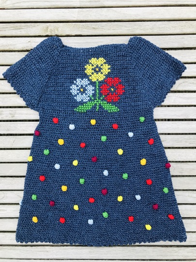 Dieses Sommerkleidchen wird in Baumwolle gehäkelt. Ob in Blau oder anderen Farben, ist ganz egal. Die Blumen sind im Kreuzstich aufgestickt. Wie das geht, wird ausführlich erklärt. Aber auch ohne dieses Stickbild sieht das Kleidchen mit seinen gehäkelten Noppen süß aus.