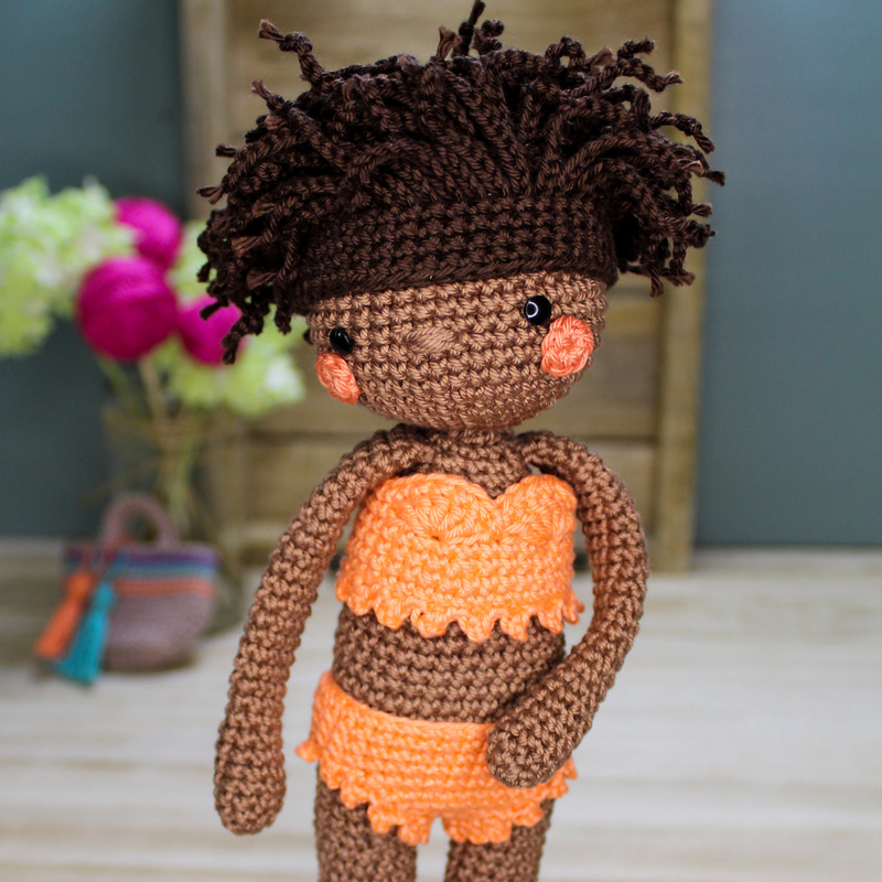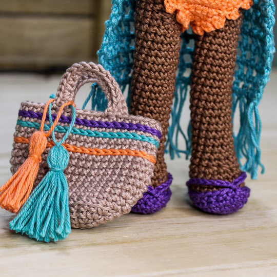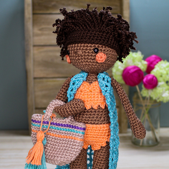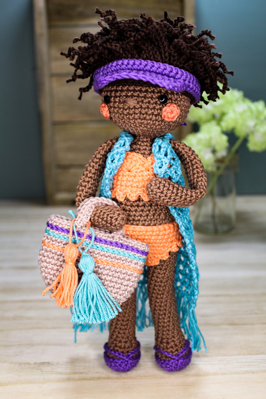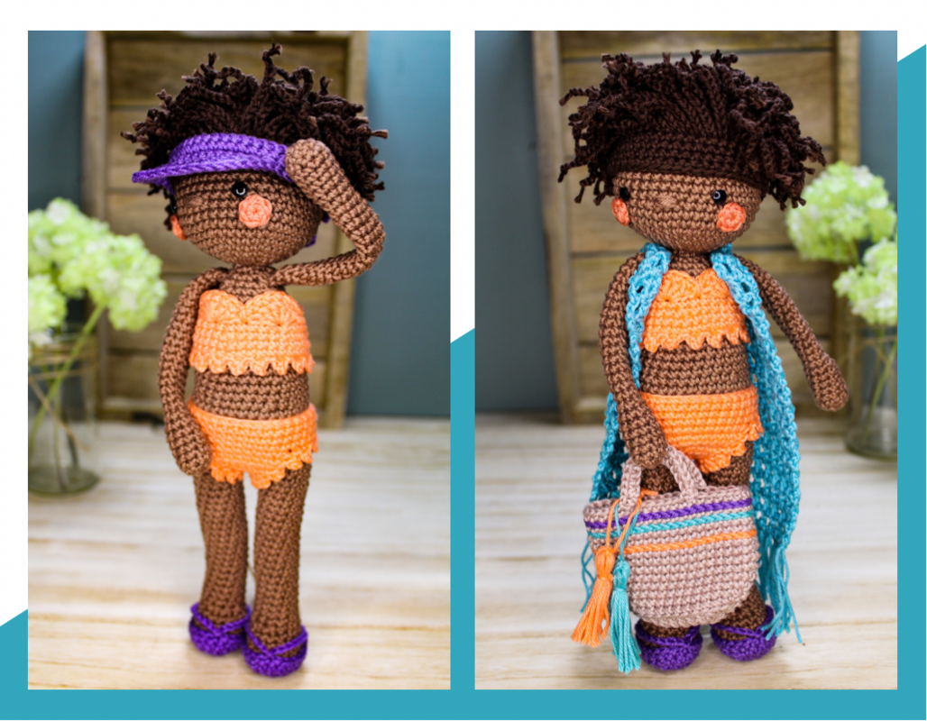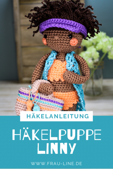 Häkelanleitung für die gehäkelte Puppe Linny im knallbunten Bikini und mit süßer Strandtasche.