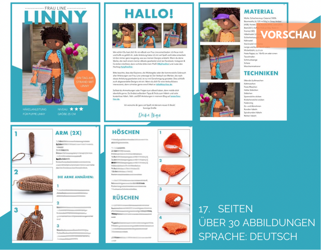 Frau Lines eBooks machen nicht nur Spaß beim Häkeln, sie sind auch zauberhaft anzusehen. Auf 17 Seiten mit vielen Abbildungen und Schritt-für-Schritt-Erläuterungen zeige ich dir, wie du deine eigene Puppe häkeln kannst. Die Häkelanleitung ist mit viel Sorgfalt gestaltet, farbig und in deutscher Sprache.