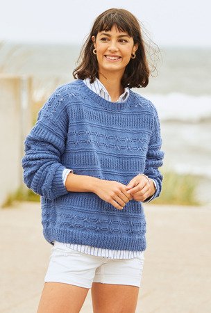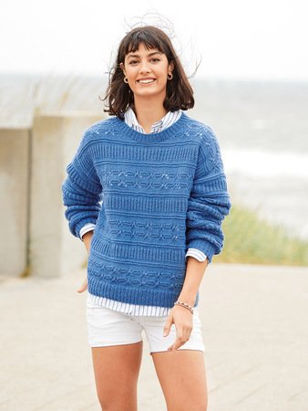 Streifenweise Rippen und Lochmuster - so kommt beim Stricken keine Langeweile auf. Bei diesem sportlichem Pulli aus reiner, organischer Baumwolle wechseln sich kraus rechts gestrickte Streifen mit glatt gestrickten Reihen und Patentmuster-Streifen mit Lochmusterreihen immer wieder ab. Das macht nicht nur Spaß, man kommt auch schnell voran, denn es ist spannend zu sehen, wie sich die Streifen der unterschiedlichen Muster immer weiter entwickeln. Gestrickt wird der Pulli im Mustermix in vier Teilen mit rundem Halsausschnitt, dessen Blende nachträglich im Rippenmuster angestrickt wird. Bei unserem Modell haben wir die sportliche Note durch das klare Blau des Garns noch hervorgehoben. Aber auch in zarten Pastells, wie zum Beispiel Rosé, entfaltet dieser Pulli seine schöne Pracht und wirkt - zum Beispiel zu einem zarten, fließenden Rock getragen – plötzlich sehr sportlich-elegant.