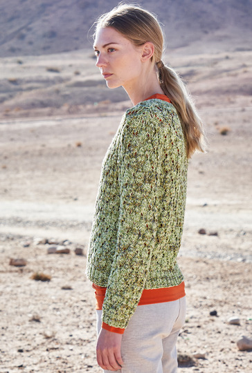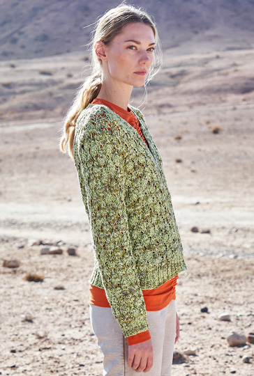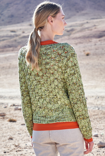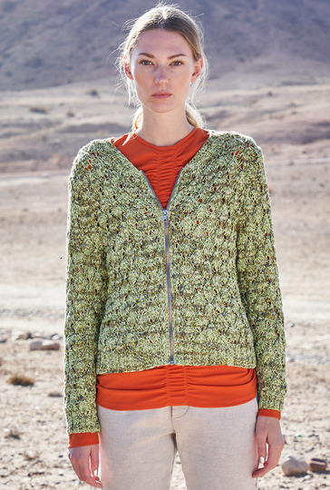 Hier darf es funkeln und schimmern! Das Fancygarn mit Lurex-Effekten bildet die Grundlage für diese sportliche Bomberjacke, die gleichzeitig sehr lebendig und edel wirkt. Das angenehme Garn mit seinem hohen Baumwollanteil ergänzt sich bestens mit dem Ajourmuster, dass luftige Blätter auf der frühlingshaften Jacke entstehen lässt. Gestrickt wird in Einzelteilen von unten nach oben. Nach dem Rippenbündchen wird das Blattmuster über alle Maschen gestrickt – das ist nicht sonderlich kompliziert zu stricken und die übersichtliche Strickschrift hilft dabei, stets den Überblick zu behalten. Lediglich bei den formgebenden Ab- bzw. Zunahmen sollte man immer im Blick behalten, dass sich Umschläge und zusammengestrickte Maschen des Musters stets ausgleichen. Sind alle Teile fertig gestrickt, geht es an die Ausarbeitung. Zuerst werden die Schulternähte geschlossen und aus den Maschen des Halsausschnitts die Blende gestrickt. Für die Stabilität werden die Verschlussränder der Vorderteile mit einer Reihe fester Maschen umhäkelt und der Reißverschluss eingesetzt. Danach alle restlichen Nähte schließen. Am besten wird die Jacke dann erst einmal gewaschen, oder kräftig angefeuchtet und im Liegen getrocknet. Dabei schön ausstreichen oder leicht spannen – so entfaltet das Ajourmuster seine volle Schönheit.