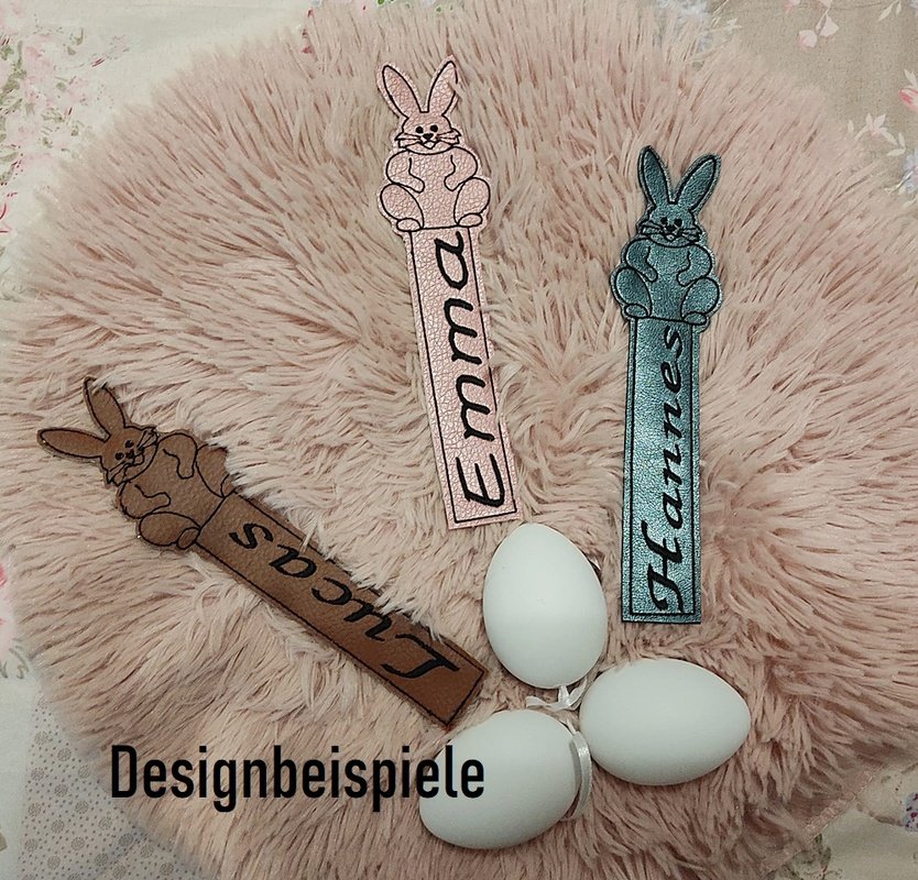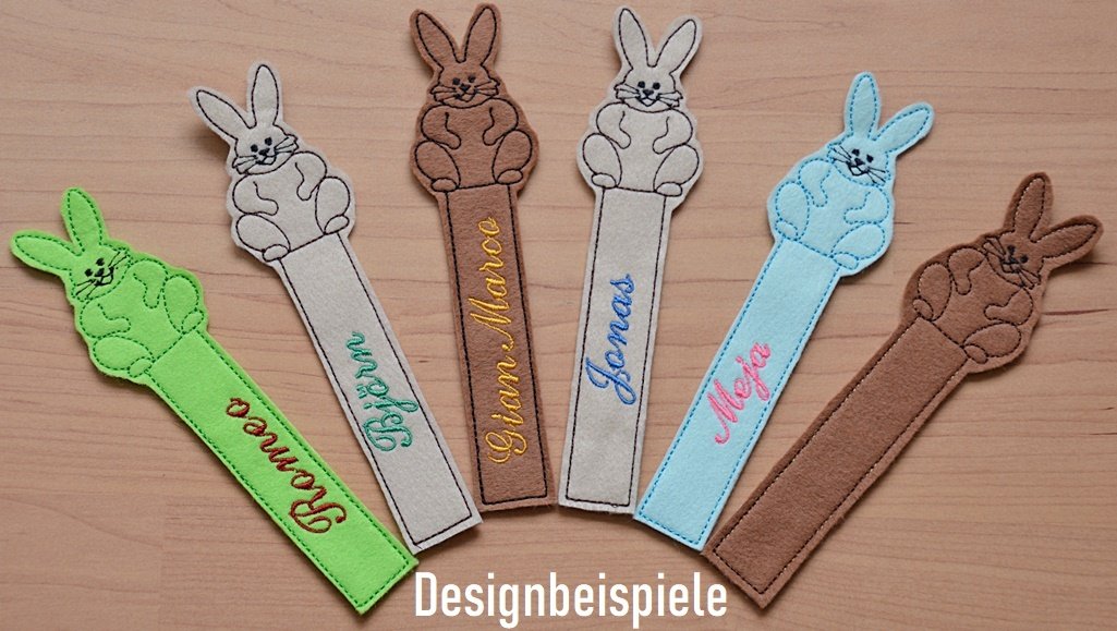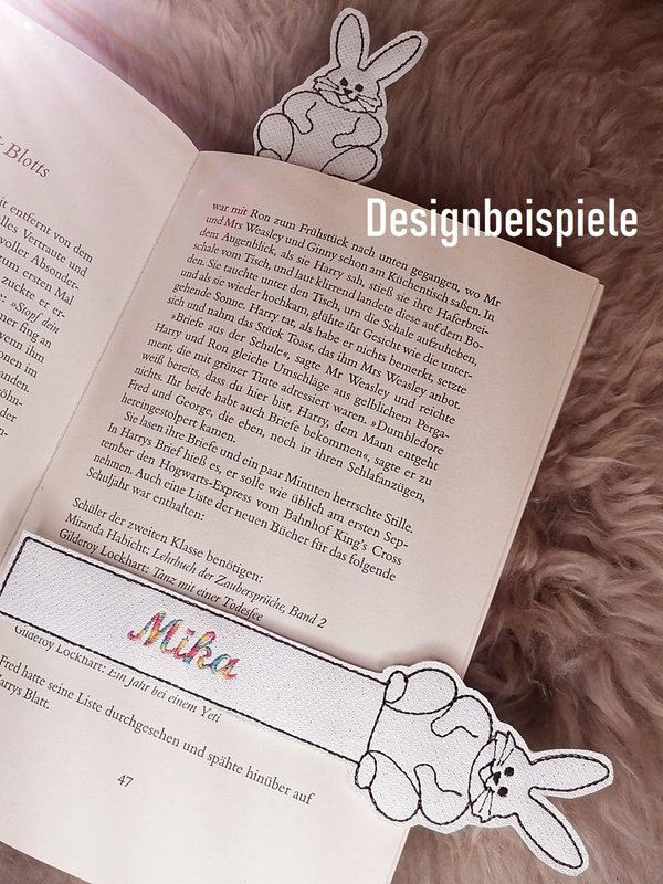 Das Lesezeichen hat genügend Platz für einen Namen oder ein kleines Motiv. Es ist auch möglich dort eine Botschaft einzufügen wie: Ich liebe dich, Viele Spass beim lesen oder was auch immer du möchtest. Es wird im 13x18 Rahmen auf Filz oder Kunstleder gestickt.