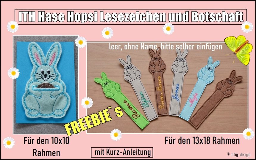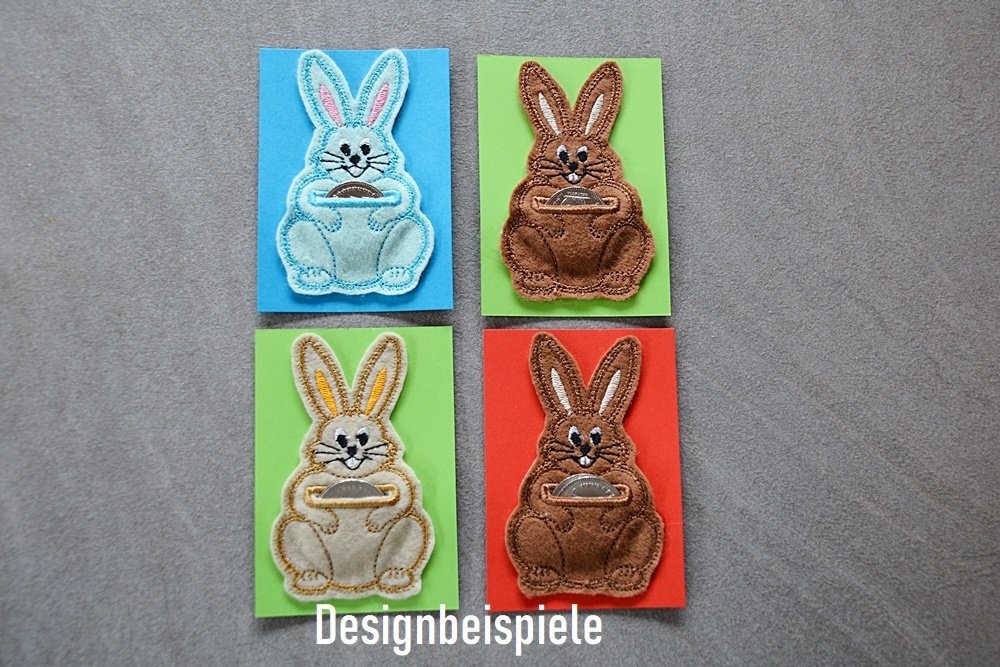 Den kleinen Hasen kannst du als Botschafter einsetzen. Ich habe ihn als Geldüberbringer benutzt. Dazu habe ich ihn ohne Rückseite gestickt und ihn am Schluss auf eine Karte geklebt. Darin kann man etwas Geld verschenken. Er wird auch auf Filz oder Kunstleder im 10x10 Rahmen gestickt (oder grösser).