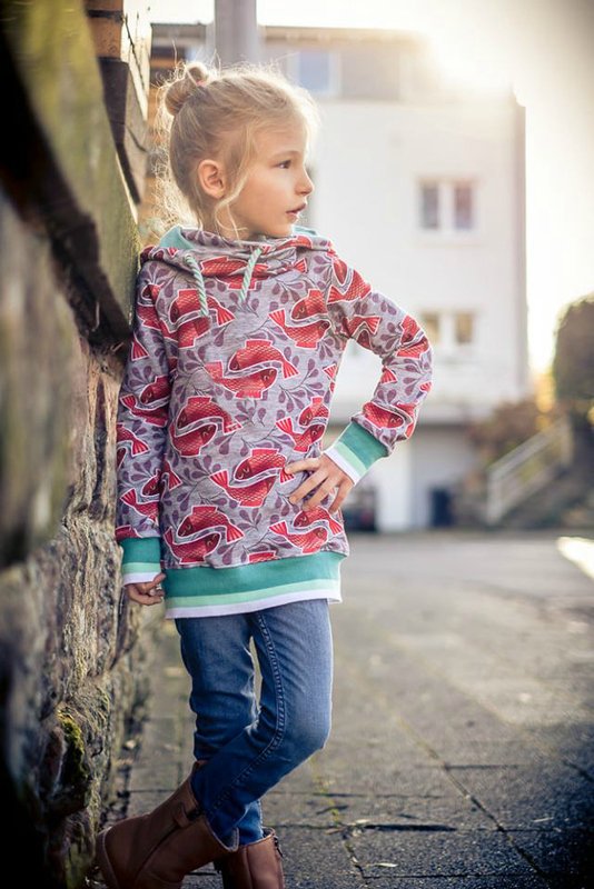 Für unseren Hoodie Vanja eignen sich etwas dickere, dehnbare Stoffe wie z.B. Sweat (angeraut oder unangeraut), French Terry, Strick, etc.. Auch dünnere Stoffe wie z.B. Jersey sind möglich.
