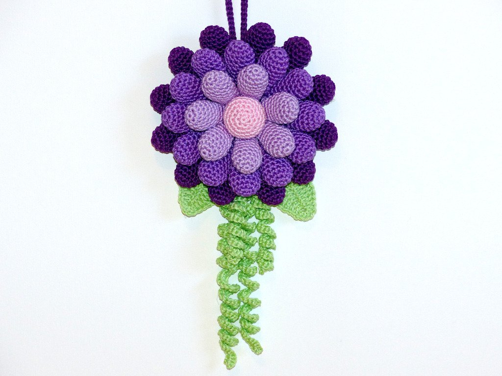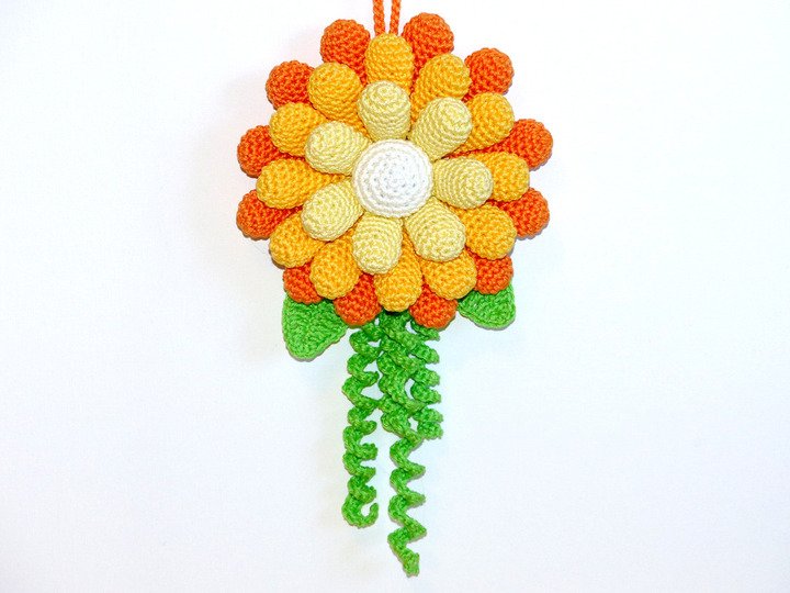 Je nach Garn- und Häkelnadelstärke variiert die Größe von dem Blumen Anhänger.