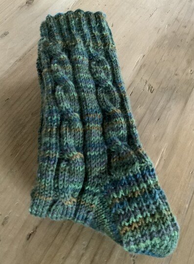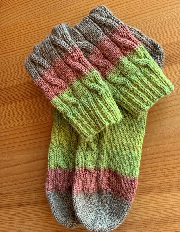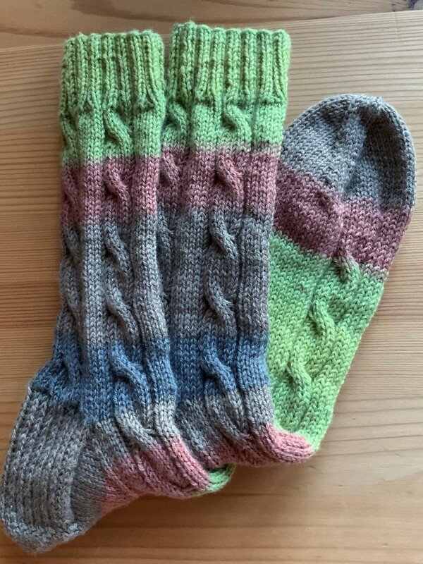 „Adelina“, schöne Socken mit einem einfachen Zopfmuster. Die Socken werden von oben nach unten gestrickt. Die Grundlagen des Sockenstrickens sollten bekannt sein. Ich habe die Ferse als Herzchenferse (mit Doppelmaschen) gearbeitet und eine Bandspitze gestrickt und beschrieben. Ferse und Spitze können jedoch auch anders ausgeführt werden.