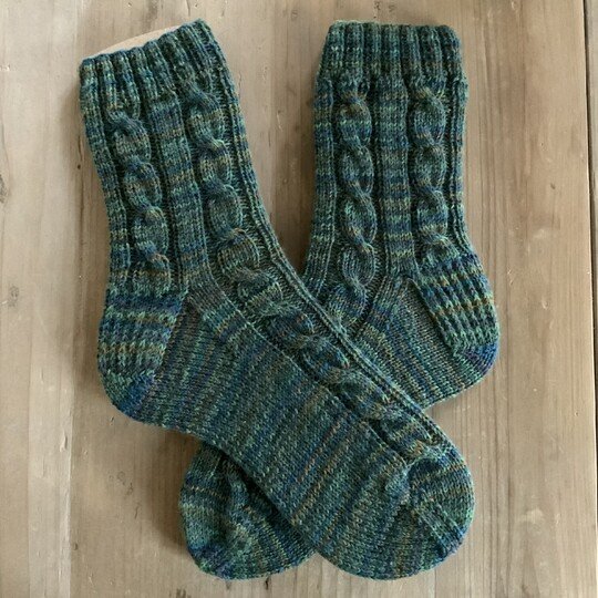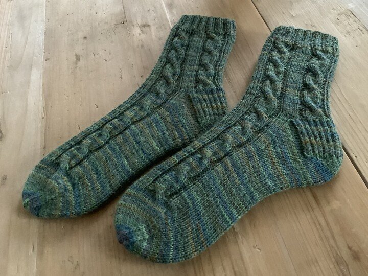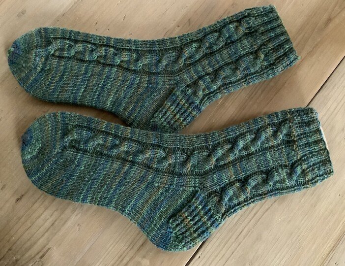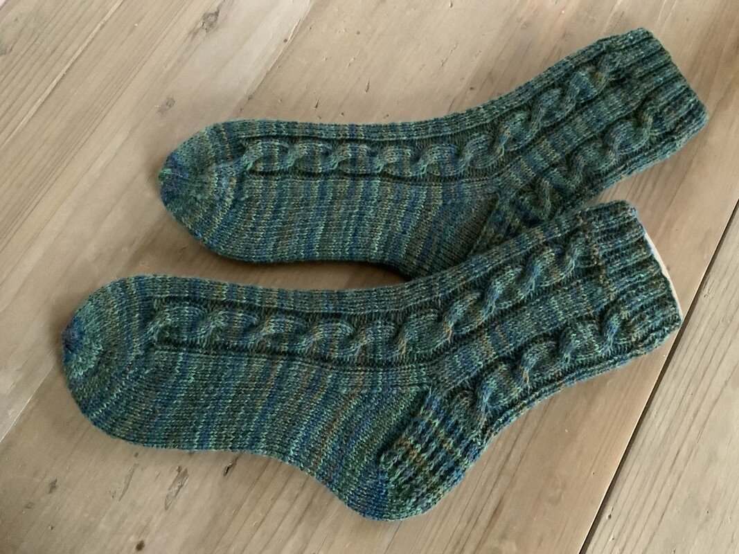 Die Mustersocken (Titelbild) sind aus Luganer Sockenwolle Seide von Ferner Wolle [60% Wolle, 20% Seide, 20 % Polyamid], die dunkelgrünen Socken sind aus myboshi, mysocks in der Farbe "Skogen"