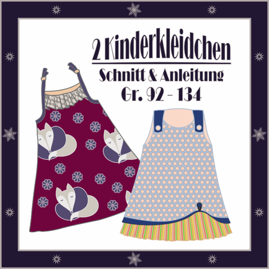 Du erhälst die Schritt für Schritt Anleitungen für die abgebildeten beiden Kinderkleidchen inkl. der Schnittmuster zum Ausdrucken. Das linke Kleidchen ist einlagig mit geknoteten Trägern zum Verstellen und auf dem Brustteil hat es eine verspielte Rüsche. Es kann aus Jersey oder Baumwolle, Cord oder Jeans genäht werden. Das rechte Kleidchen ist zweilagig und für leichte Baumwollstoffe ideal. Durch den aufgesetzten Knopf mit der Schlaufe bekommt es ein extra verspielte Note. Beide Kleider lassen sich auch als Tunikakleidchen über Hosen tragen.