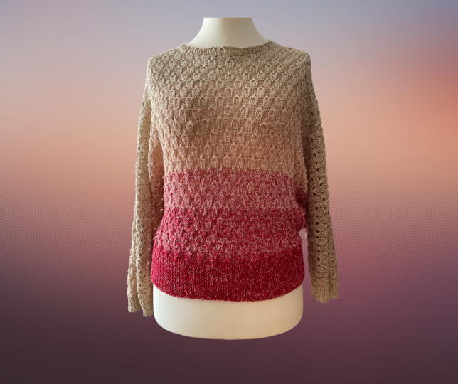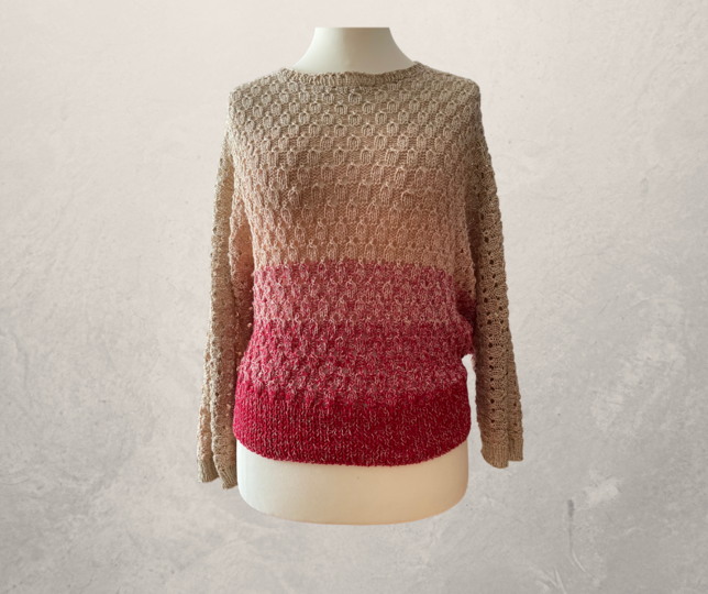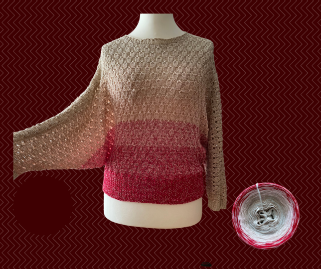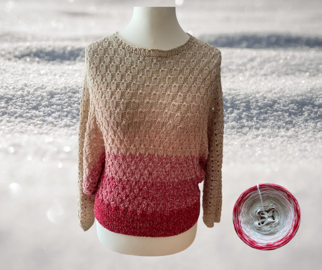 Dieser schöne Pullover wird mit zwei gleichen Bobbeln in zwei Teilen gestrickt. So ist der Farbverlauf vorne und hinten identisch. Ein feines Ajourmuster sorgt für die Eleganz.