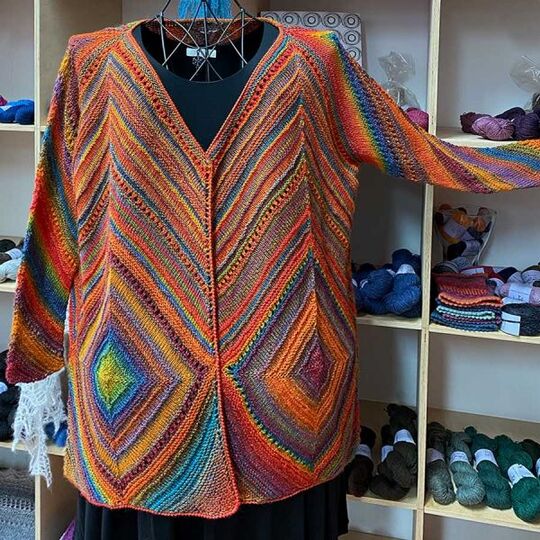 Die unterschiedlichen Strickrichtungen bringen das Farbenspiel bunt gemusterter Garne perfekt zur Geltung und machen die Jacke zu einem echten Hingucker!