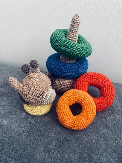 Ein weiches Babyspielzeug zm greifen und ordnen mit Stapelringen und einem Giraffenkopf. Schritt für Schritt Anleitung mit vielen Bildern