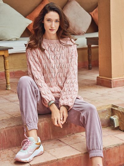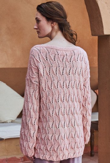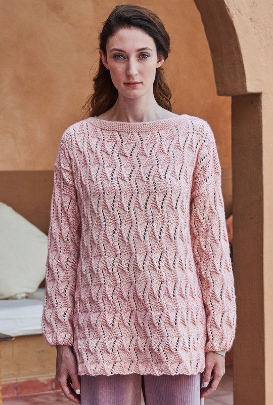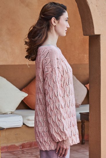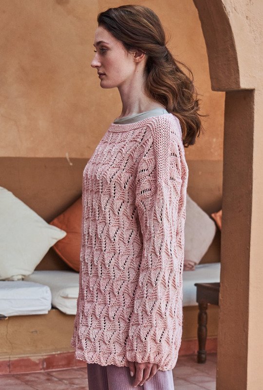 Anschmiegsam und weich zeigt dieser Longpulli, dass auch einfache Strukturen Wirkung zeigen. Mit U-Boot-Ausschnitt und Keulenärmeln ein Hingucker – auch für ungeübte StrickerInnen. Denn alle Teile sind ganz gerade gestrickt, es gibt weder Ab- noch Zunahmen im Ajourmuster zu berücksichtigen. Rücken- und Vorderteil beginnen direkt nach der linken Rückreihe schon mit dem Lochmuster – dieses ist nicht zu komplex und die übersichtliche Strickschrift hilft dabei, stets den Überblick zu behalten. Zum Abschluss werden noch einige Reihen kraus rechts gestrickt – diese bilden den Abschluss des Halsausschnitts und gleichzeitig einen schönen Zierstreifen auf den Schultern. Für die wirkungsvollen Ärmel werden gleich nach dem Anschlag Maschen zugenommen, danach geht es auch hier immer im Ajourmuster gerade hoch. Zum Schluss noch alle Nähte schließen – fertig ist der neue Begleiter für die schönen Frühlingstage.