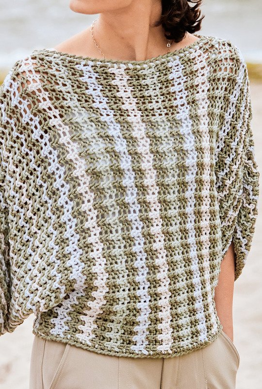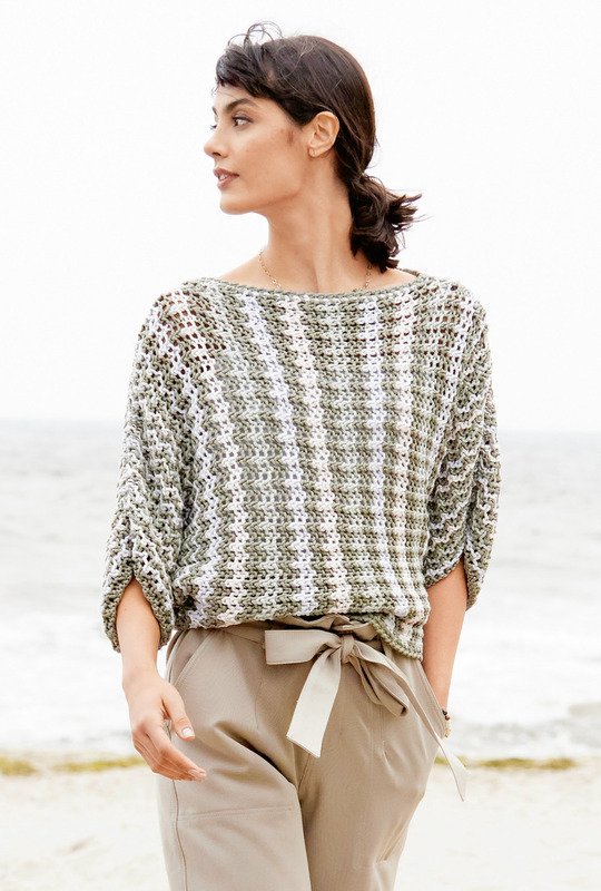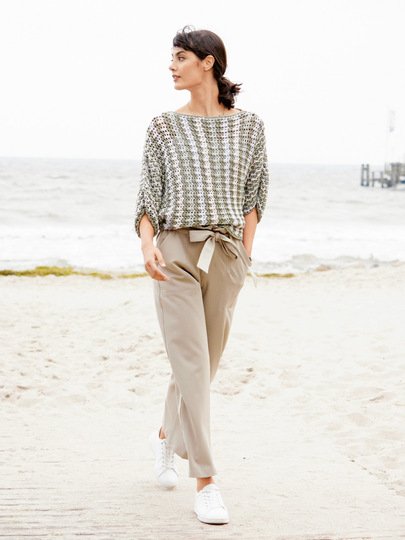 Fledermausformen haben einen großen Vorteil: Sie sind weit, bequem und lässig. Kommen sie dann noch mit so einer raffinierten Optik daher, wie dieses Design sie uns bietet, werden sie obendrauf noch zum modischen Hingucker! Aber auch der Strickspaß kommt hierbei nicht zu kurz. So ist das raffinierte Lochmuster mit seinem Rapport von vier Maschen und zwei Reihen eingängig und leicht zu merken. Durch das Streifendesign kommt Abwechslung ins Spiel – und Geschwindigkeit, da es einfach Spaß macht zu sehen, wie sich die Farben immer weiter entwickeln. Da dieser Lochmuster-Pulli quer von Arm zu Arm gestrickt wird, ist auch die Ausarbeitung keine große Hürde: Nur noch die Schulter-Ärmelnähte und die Seitenkanten schließen, den Saum und dien Halsausschnitt mit einer Runde Krebsmaschen umhäkeln – und fertig ist der durch Seiden- und Modalanteile schön fließende und durch Kaschmir angenehm weiche Lieblingspulli.