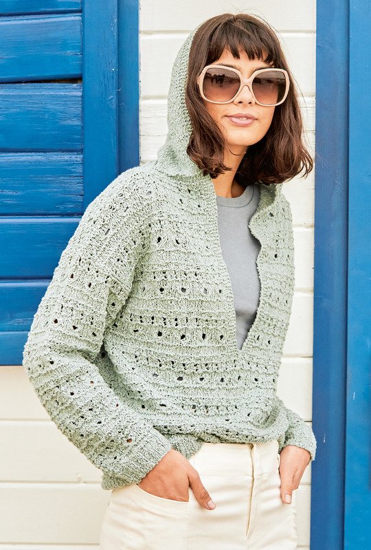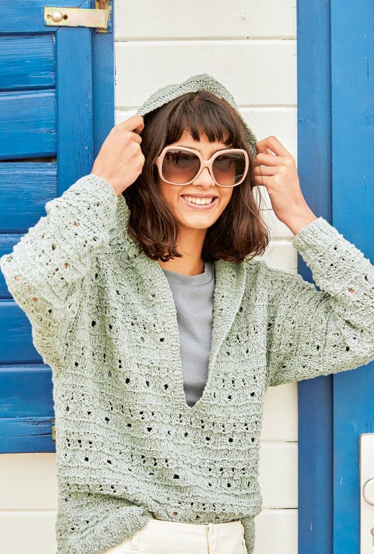 Genau das Richtige, wenn eine frische Brise aufkommt: der trendige Hoodie im Mustermix aus einem dezent genopptem Baumwollgarn macht einfach alles mit! Unterschiedliche Rippen- und Strukturmuster wechseln sich mit kraus rechts und glatt rechts gestrickten Partien ab und bilden mit den feinen Noppen des Garns ein harmonisches Zusammenspiel. Verkreuzte Maschen und Umschläge sorgen für Leichtigkeit im Muster, die übersichtliche Strickschrift wiederum sorgt dafür, dass stets der Überblick gewahrt bleibt. Begonnen wird das Strickvergnügen mit dem Rückenteil, dann das Vorderteil mit dem tiefen Schlitz, dessen Blenden gleich in kraus rechten Maschen mitgestrickt werden. Nach der Fertigstellung der Ärmel geht es dann an die Kapuze. Dafür werden erst einmal die Schulternähte geschlossen, dann die zuvor stillgelegten Maschen des rechten Vorderteils, des Rückenteils und des linken Vorderteil mit einer Rundstricknadel aufgefasst und schließlich die Kapuze in glatt rechts mit direkt angestrickten Blenden in kraus rechts gearbeitet. Zum Schluss noch die Ärmel einsetzen und die Seitennähte schließen.