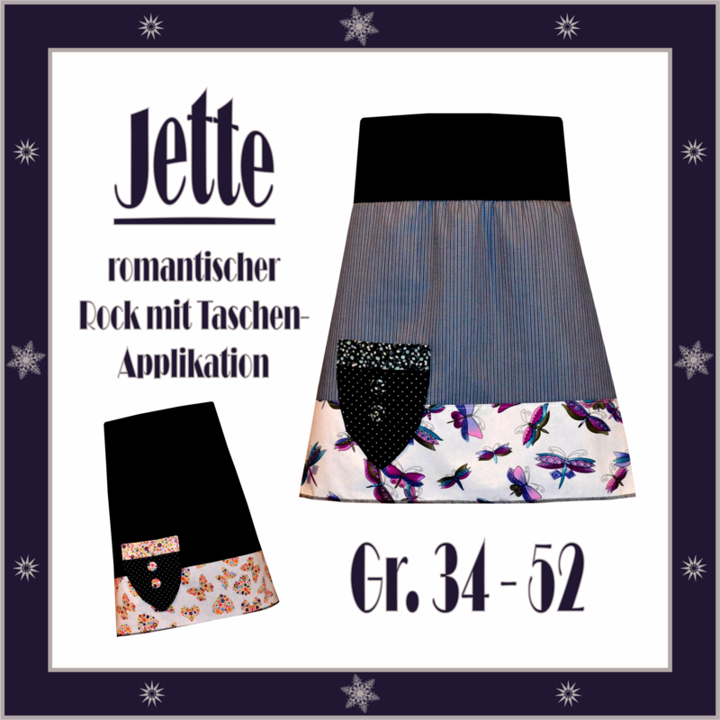 Verspielter Rock mit Jerseybund und kleiner Tasche in Gr. 34-52. Der Rock wird leicht hüftig getragen und ist auch ideal als Umstandsrock durch den schönen breiten Stretchbund.
