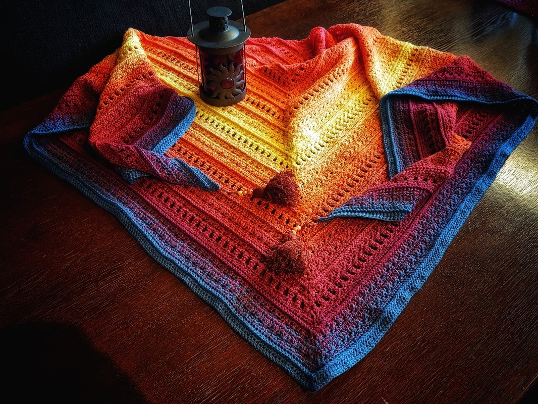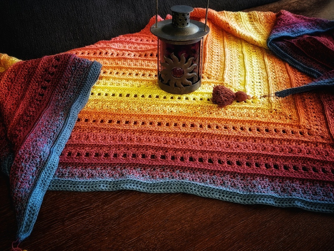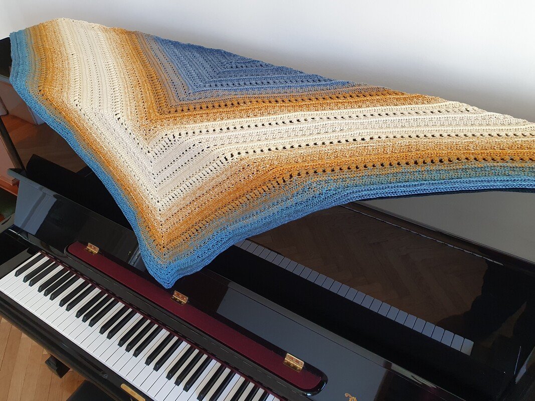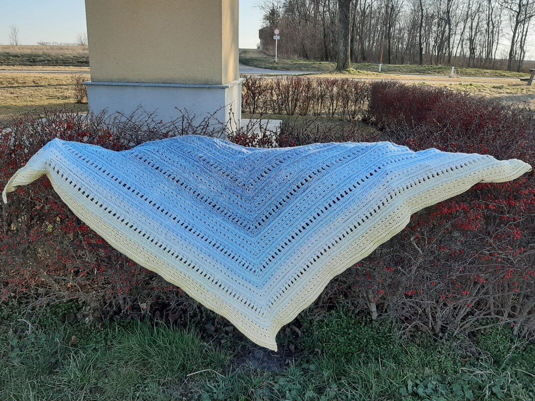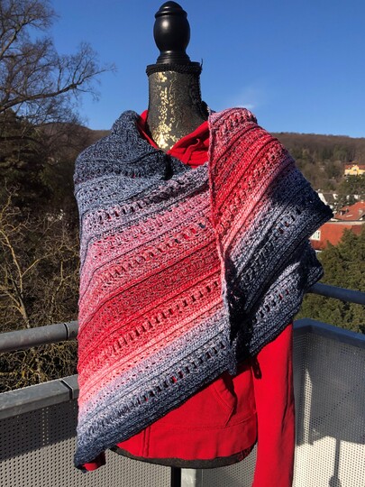 Das Tuch auf der Startseite wurde mit einem Bobbel mit 1375 m 4-fädig und Nadelstärke 3,75 angefertigt und misst ca. 198 x 77 cm.