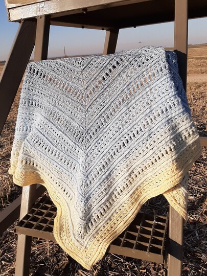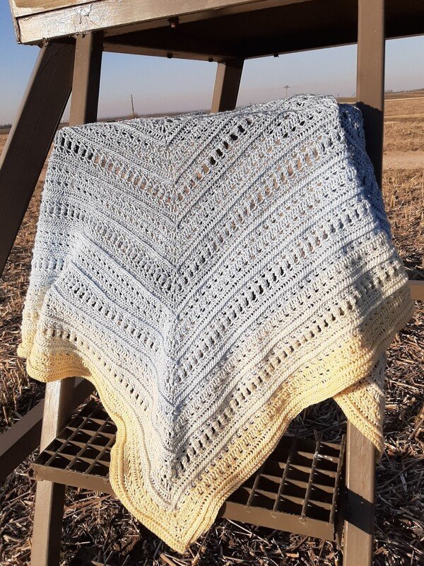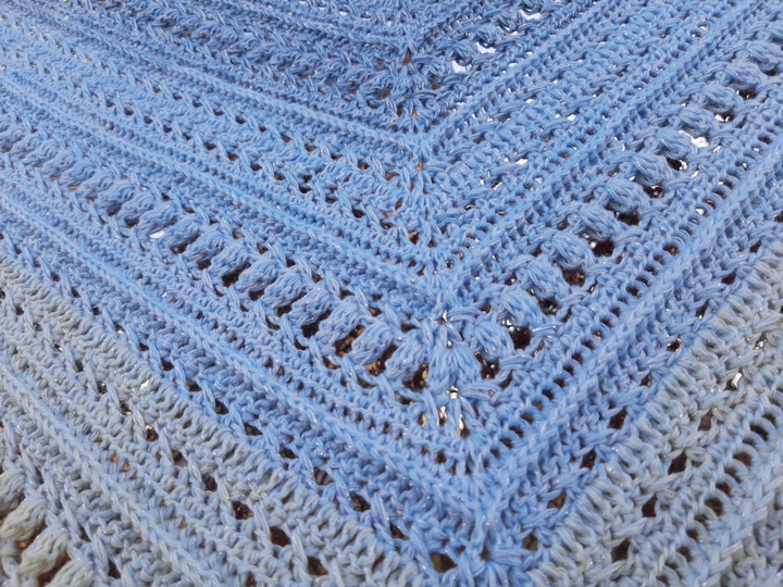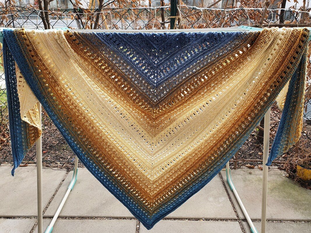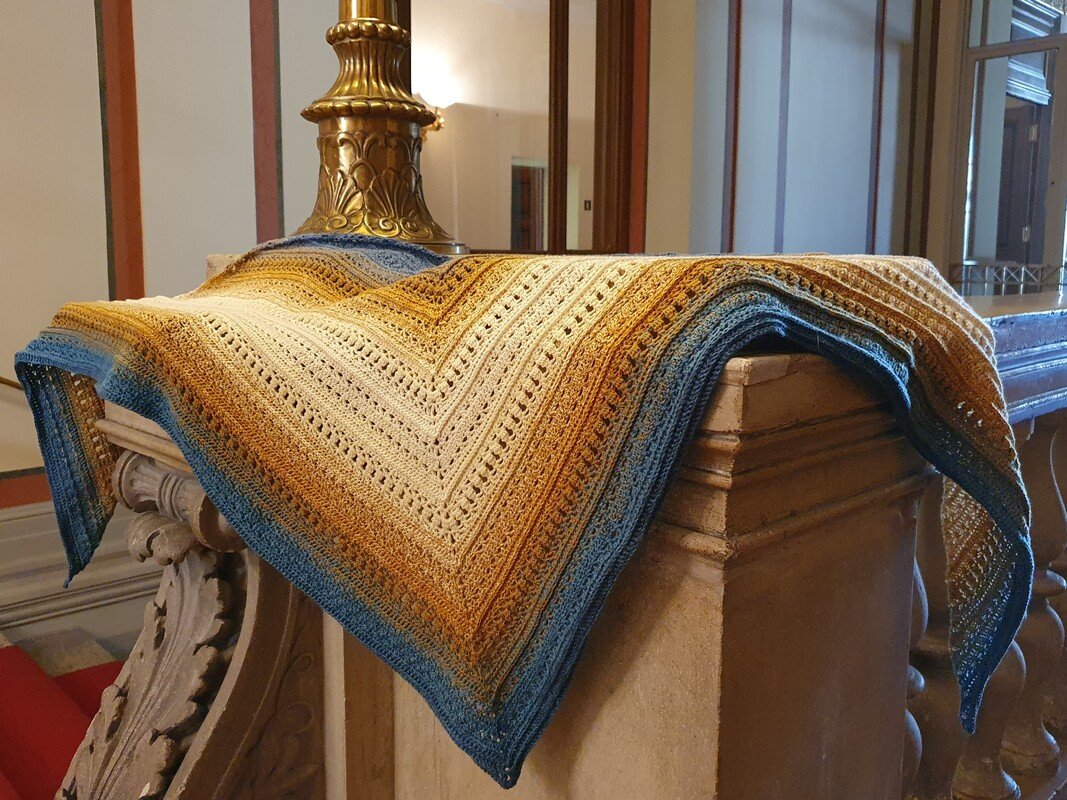 Das Tuch auf der Startseite wurde mit einem Bobbel mit 1375 m 4-fädig und Nadelstärke 3,75 angefertigt und misst ca. 198 x 77 cm.