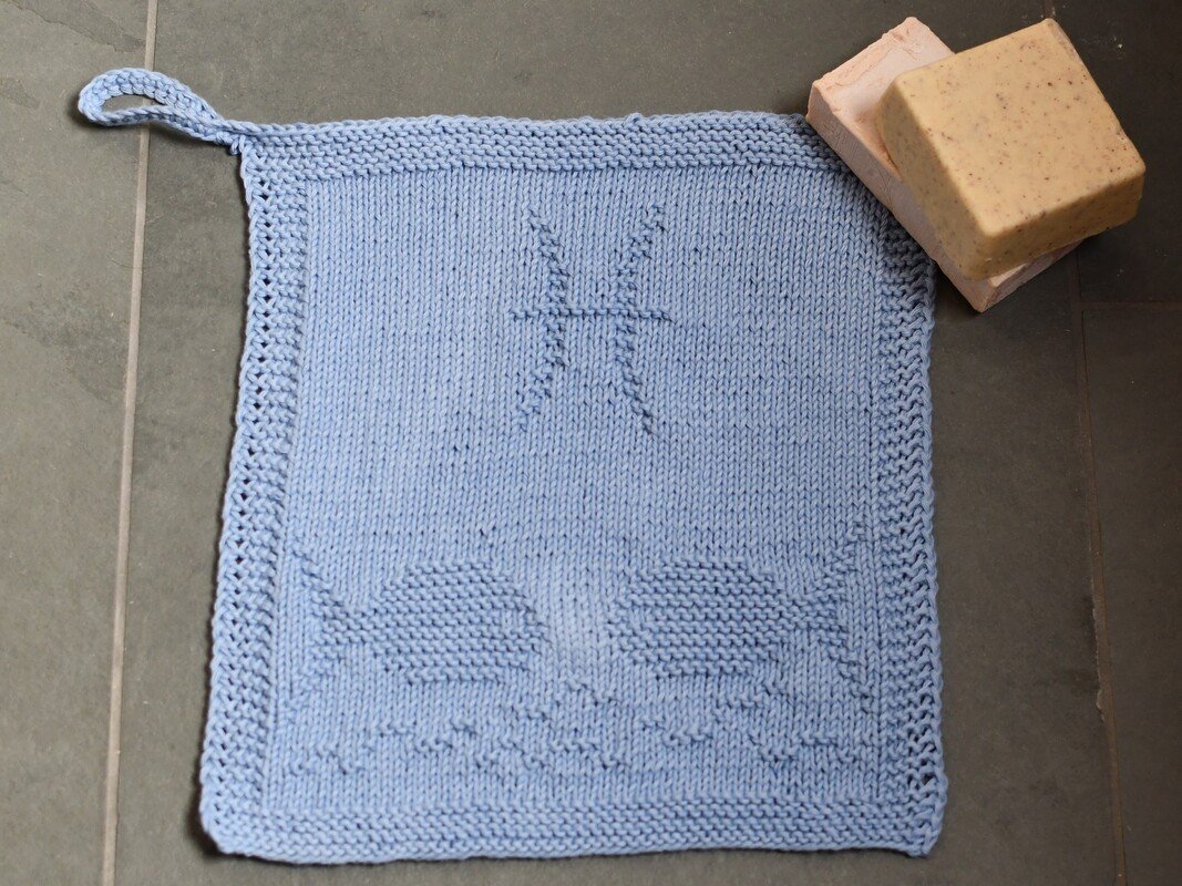 Zum Geburtstag, zu Weihnachten oder einfach als kleine Aufmerksamkeit kannst Du mit diesem Motiv einem lieben Menschen im Sternzeichen Fische eine Freude machen. Je nachdem, welches Garn Du verwendest, kannst Du ein Spültuch oder einen sanften Waschlappen stricken. Garnvorschläge für die verschiedenen Projekte findest Du weiter unten. Nachgestrickt werden kann das Tuch ganz einfach nur mit rechten und linken Maschen.