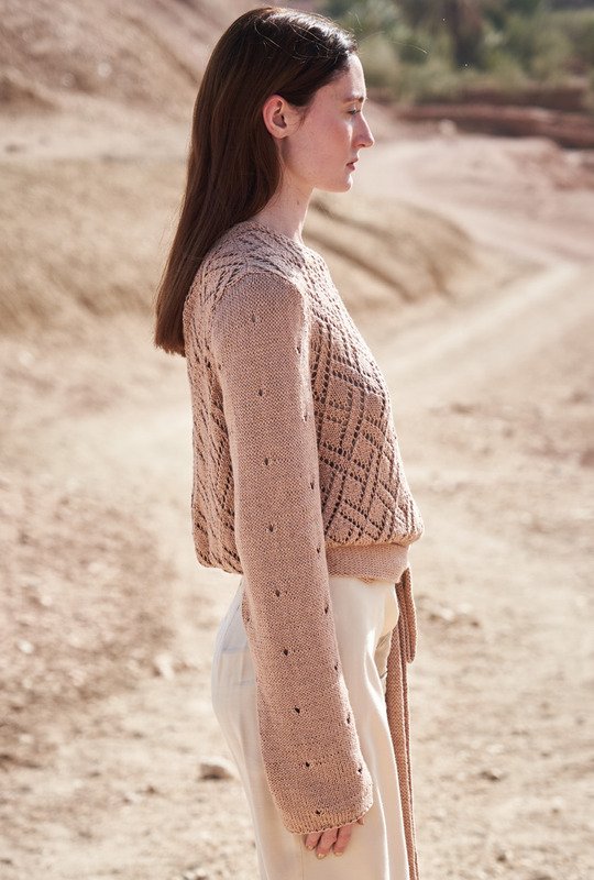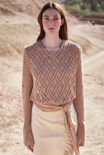 Gegensätze ziehen sich an: Für den Korpus ein ausdrucksstarkes Rautenmuster, für die langen Ärmel ruhige Lochstrukturen. Ein breites Bindeband bringt alles schön auf Taille. Zusammen mit der klassischen, edlen Farbe ist das definitiv ein Rezept für den nächsten Lieblingspulli! Sowohl beim Vorderteil, als auch beim Rückenteil beginnt der Musterspaß direkt nach dem Maschenanschlag – denn dann wird direkt mit dem Ajourmuster begonnen, dass diesen eleganten, geflochtenen Effekt mit sich bringt. Das Vorderteil erhält am Ausschnitt einen direkt angestrickten I-Cord und betonte Abnahmen – sehr edel! Die Ärmel werden dann mit dezent eingestreutem Lochmuster gestrickt. Für beide Muster enthält die Anleitung übersichtliche, hilfreiche Strickschriften. Sind die Ärmel fertig, wird noch das Bindeband gestrickt. Dann alle Nähte schließen, den rückwärtigen Halsausschnitt auch mit einem I-Cord Rand versehen. Ist auch der Gürtel angenäht, sollte der neue Pullover noch ein kleines Bad nehmen. Dadurch legt sich das schöne Lochmuster richtig und entfaltet seine ganze Schönheit.