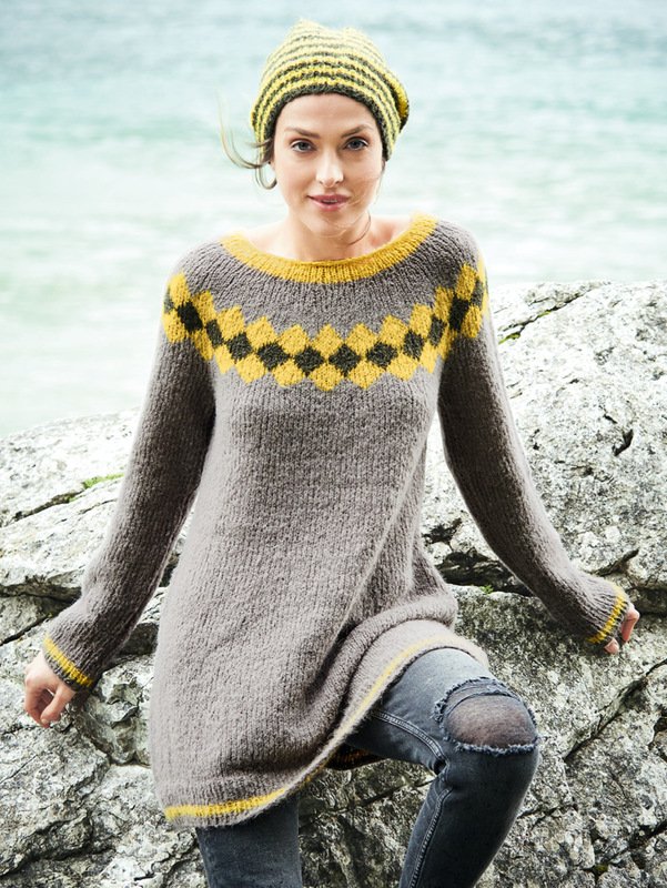Gelb blitzt auf graubraunem Fond besonders intensiv. Bei dieser Tunika umgesetzt in den Blenden und der dekorativen Rundpasse im Jacquardmuster. Ansonsten ist das Minikleid bis auf die als Rippenmuster gearbeiteten Bündchen glatt rechts gestrickt. In den Bündchen erscheint das Gelb nochmals als schmaler Streifen. Und auch die Ringelmütze überzeugt in dieser schönen Farbkombination. Alles ist aus weichem Alpakagarn gestrickt. Die Anleitung der Tunika ist zu haben in den Größen 38/40, 42/44 und 46/48, die Mütze für 52 – 54 cm Umfang.