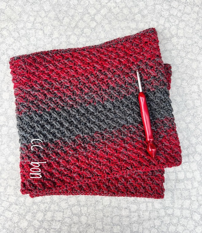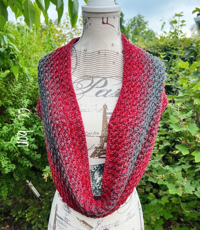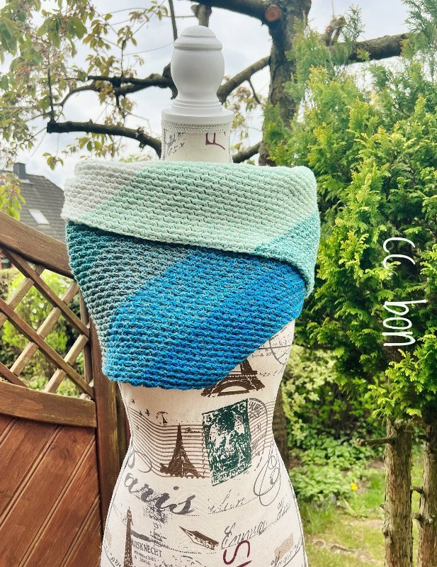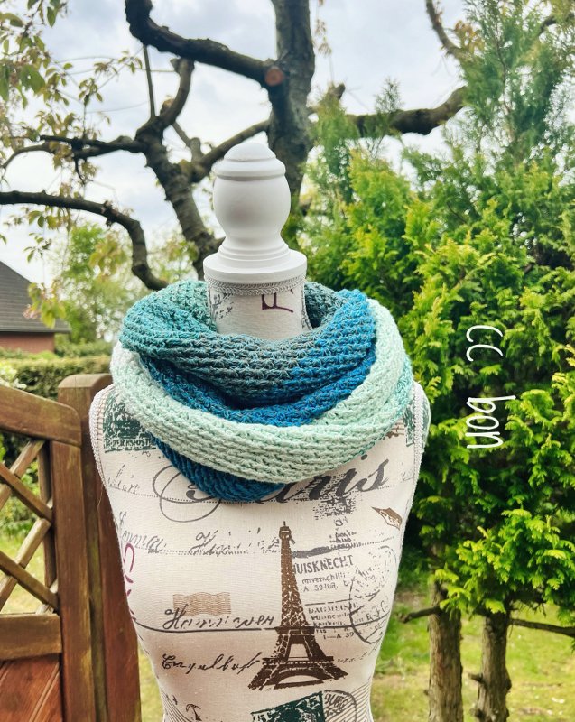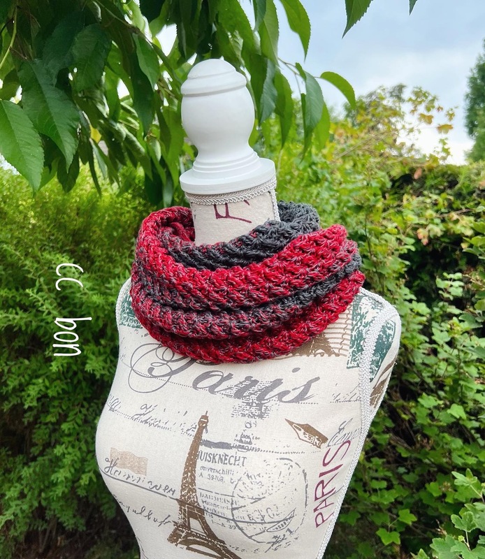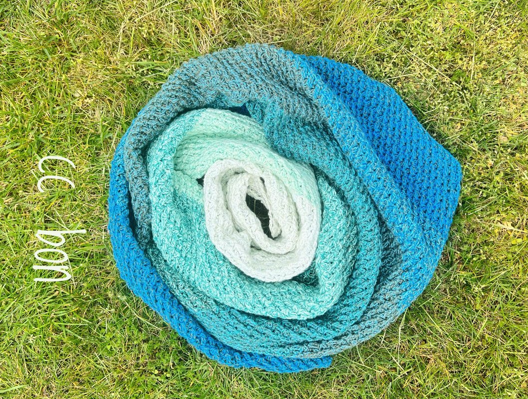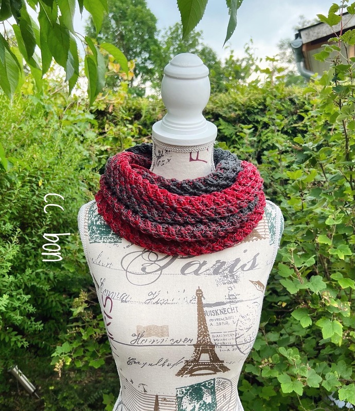 Es kann beliebiges Garn verwendet werden. Ich habe 4fädiges Farbverlaufsgarn und Häkelnadeln der Stärke 4.0 und 4.5 verwendet. Für den für den im Titelbild gezeigten Loop wurden ca. 600 m Garn verbraucht, für den Kinderloop die Hälfte. Verwendest du ein Verlaufsgarn mit Farbwechseln, dann ensteht der Verlauf von unten nach oben.
