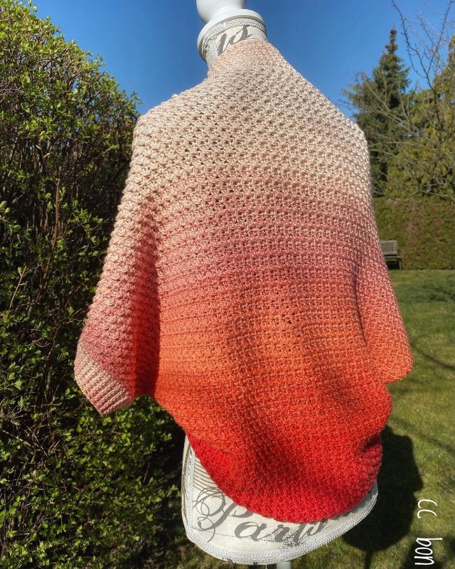 Für das Bonus-Tuch wurden 1250 m 3fädiges Farbverlaufsgarn mit NS 3.0 verarbeitet.
