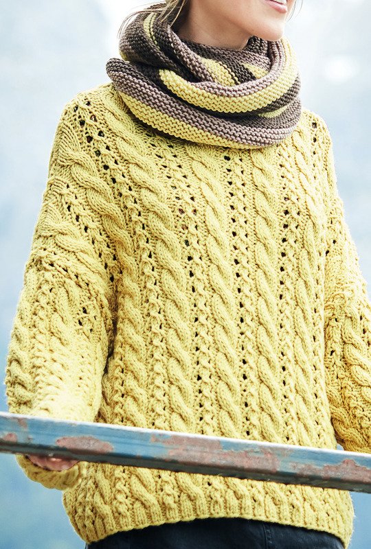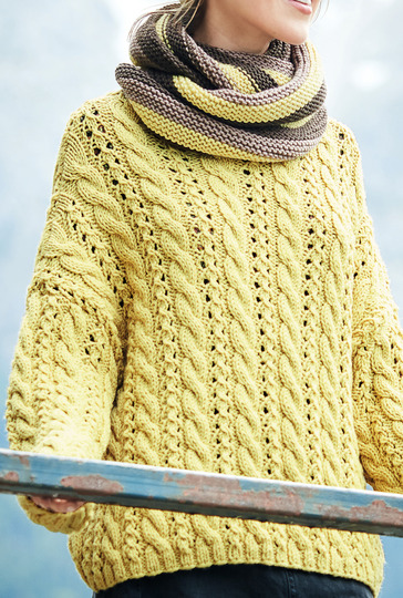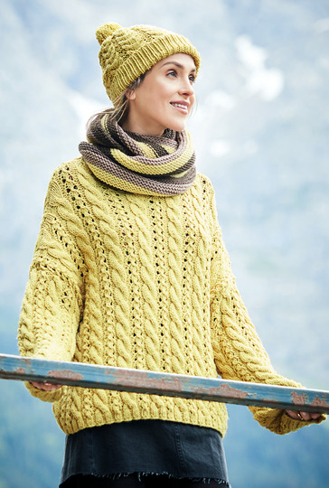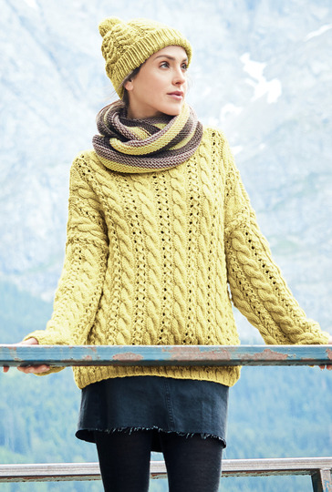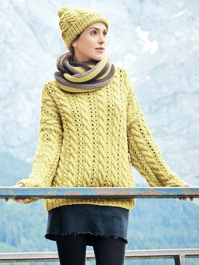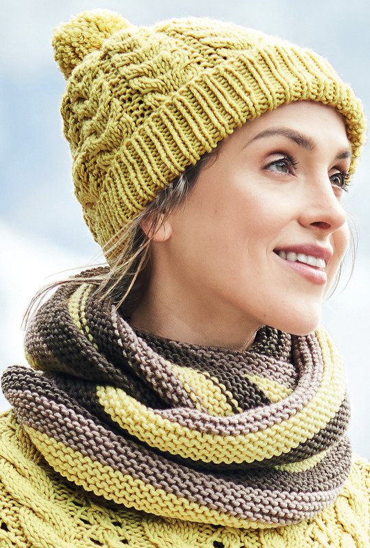 So ein Set bestehend aus Oversize-Pulli, geringeltem Loop und Pudelmütze mit Bommel wünschen wir uns schon lange. Und ganz klar: Die Kombination aus Limette mit Dunkel- und Mittelbraun vertreibt den Winterblues. Der Pullover hat vertikale Zopf- und Lochmusterstreifen, der Loop ist ganz einfach kraus rechts gestrickt, die Mütze wiederum besteht hauptsächlich aus Tulpenzöpfen. Eine Anleitung kannst du für den Pulli in Größe 38/40 und 44/46; für den Loop mit 116 cm Umfang und für die Mütze mit 44 – 46 und 48 – 50 cm Umfang downloaden.