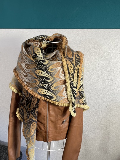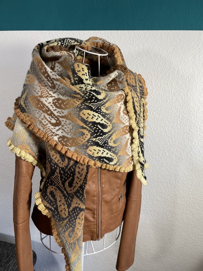 Hinweis: um das Einrollen des Tuches zu verhindern, gibt 2 Varianten. Variante 1 wird nach dem Abketten der letzten mit einer Häkelkante umhäkelt. Hier werden zusätzlich ca. 75 g in der Schmuckfarbe benötigt. Variante 2 wird mit einer kraus rechten Blende gearbeitet.