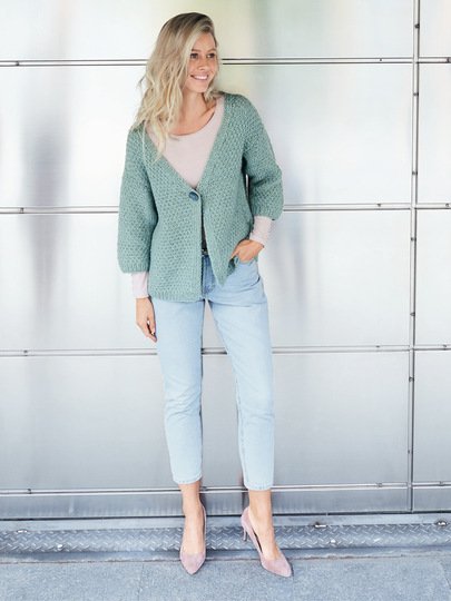 Edles Stück: Durch das voluminöse Schurwoll-Kaschmirgarn kommt das große Perlmuster (auch Gerstenkornmuster genannt) dieses Cardigans besonders schön zur Geltung. Unter den Armen und an den Seiten wird glatt rechts gestrickt, die mitgestrickte Blende ist genau wie alle Bündchen als 1/1-Rippenmuster gearbeitet. Das Mitstricken der Blenden erspart am Schluss das Auffassen der Maschen, somit müssen nur die Schulter-, Seiten- und Ärmelnähte zusammengenäht werden. Geschlossen wird die Jacke mit einem Druckknopf, der sichtbare dekorative Knopf dient lediglich zur Zierde. Nachstricken kannst du die Jacke in den Größen 38/40, 42 und 44/46.