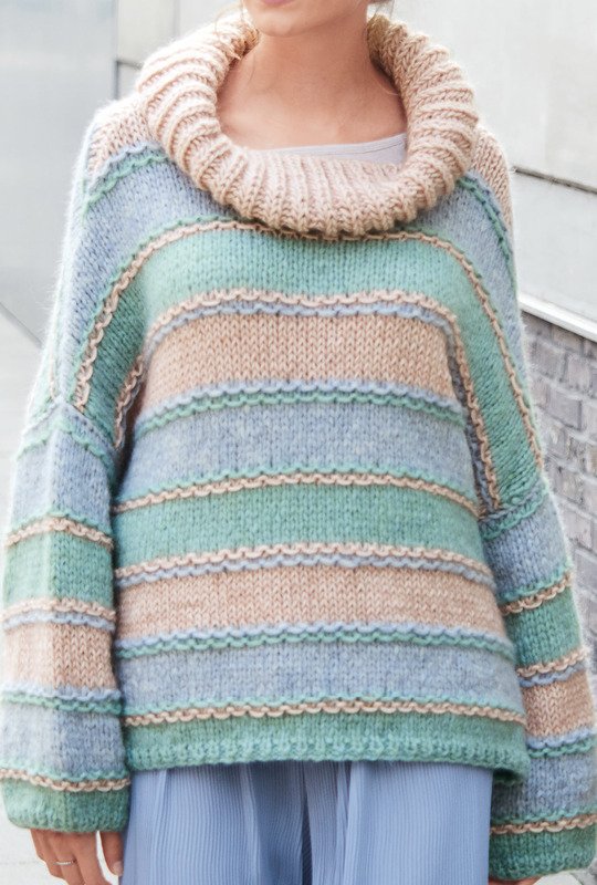 Helle Freude und das gleich streifenweise: Der Oversize-Pulli spielt mit drei wunderschönen, harmonisch aufeinander abgestimmten Pastell-Nuancen in Mint, Hellblau, Rosa. Ein Pulli, so richtig zum Reinkuscheln, denn die überschnittenen Schultern und die weiten Ärmel, überhaupt der großzügige Schnitt laden geradezu dazu ein. Mit Nadeln Nr. 8 schnell zu stricken, einfach glatt rechts und ein einfaches Webmuster, so ist das Modell auch für StrickanfängerInnen hervorragend geeignet. Auffallend ist der großzügige Rollkragen, der wie ein Wasserfall um den Ausschnitt fällt. Du kannst den Pulli in den Größen 36/38, 40/42 und 44/46 nachstricken.
