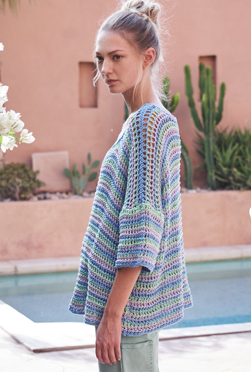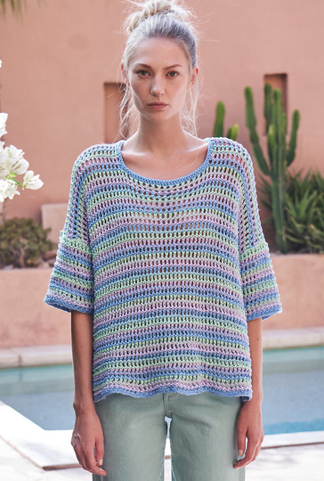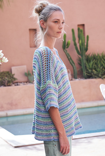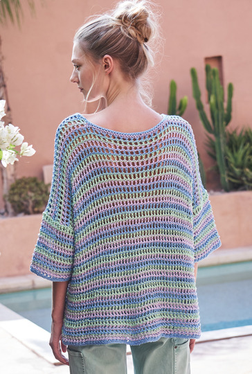 Bei diesem lässigen Pulli kommt ein schlichtes Allover-Lochmuster zum Einsatz, das streifenweise und in drei schönen Frühlingsfarben gute Laune verbreitet. Gestrickt wird der luftige Pulli in einzelnen Teilen, jeweils von unten nach oben. Das Netzmuster ist ganz einfach zu stricken und mutet schon fast ein wenig wie Häkelmaschen an. Auch der Schnitt ist ganz gerade und sieht mit etwas Mehrweite getragen am lässigsten aus. Lediglich bei dem Halsausschnitt und den Zunahmen der Ärmel sollte darauf geachtet werden, dass sich Umschläge und zusammen gestrickte Maschen des Musters stets ausgleichen. Ist alles fertig werden die Nähte schlossen und der Halsausschnitt noch mit einer Runde rechter Maschen umstrickt – fertig ist das fröhliche Mesh-Shirt.