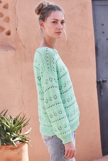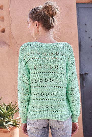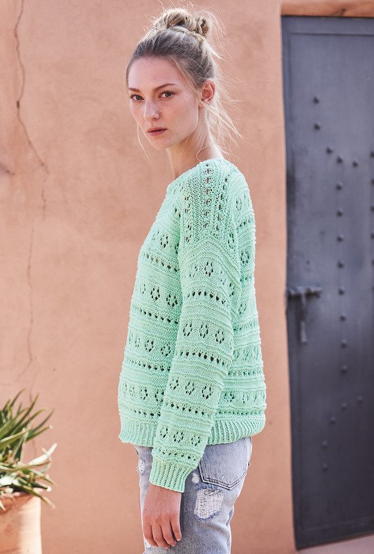 Frische Töne wie dieses helle Papagaiengrün bringen uns leicht und geschmeidig in Frühlingslaune. Das gleichmäßige Wechselspiel von Loch- und Ajourmustern lässt beim Stricken keine Langeweile aufkommen. Gute Laune bereitet auch das Garn: Aus recycelter Baumwolle und Polyester (PET) von recycelten Kunststoffflaschen hergestellt, machen wir mit jeder Masche die Welt ein kleines bisschen besser. Gestrickt wird der Gute-Laune-Pulli in einzelnen Teilen. Den Anfang macht immer das Rippenbündchen, danach geht es in der abwechslungsreichen Musterfolge weiter. Für diese wechseln sich krause und glatte Reihen mit dem kleinen Lochmuster und dem Ajourmuster ab. Sind alle Teile fertig gestrickt, werden noch die Nähte geschlossen und eine Blende an den Halsausschnitt gestrickt. Am besten bekommt der Pulli vor den ersten tragen noch ein kleines Bad und wird liegend schön ausgestrichen getrocknet. Dadurch legt sich das schöne Lochmuster richtig und entfaltet seine ganze Schönheit.