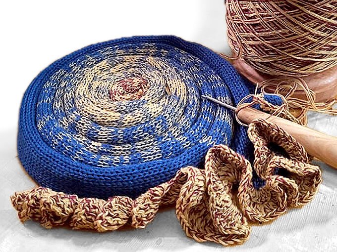 Als Garn habe ich hier 2 Bobbel (Woolly Hugs COTTON Nr. 55) benutzt, aber es gehen auch kunterbunte Sockenwollreste und alles andere an Garnen.