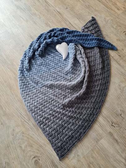 Mein Tuch hat die ca. Maße von 190 cm x 70 cm in der Tiefe und ist nahezu symmetrisch. Du kannst das Tuch beliebig groß stricken.