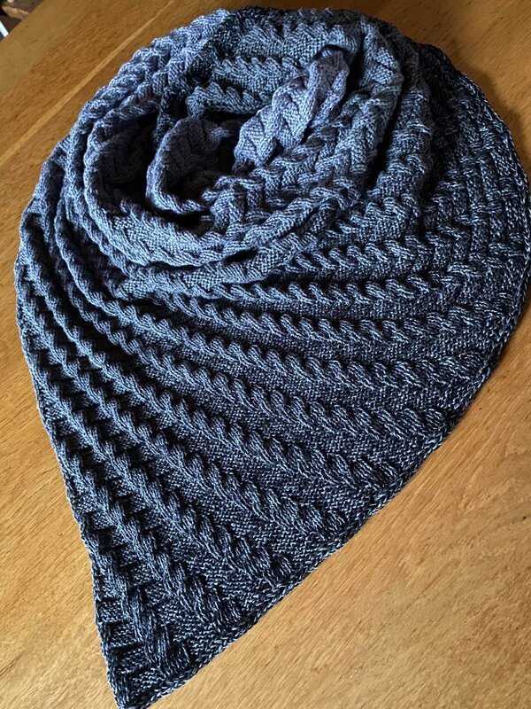 Es wird von der seitlichen Spitze aus gestrickt, ist aber fast symmetrisch.