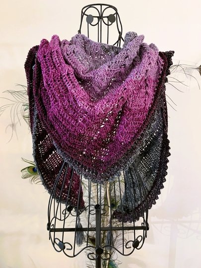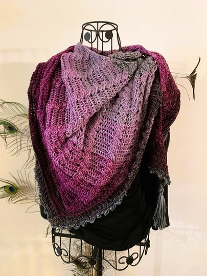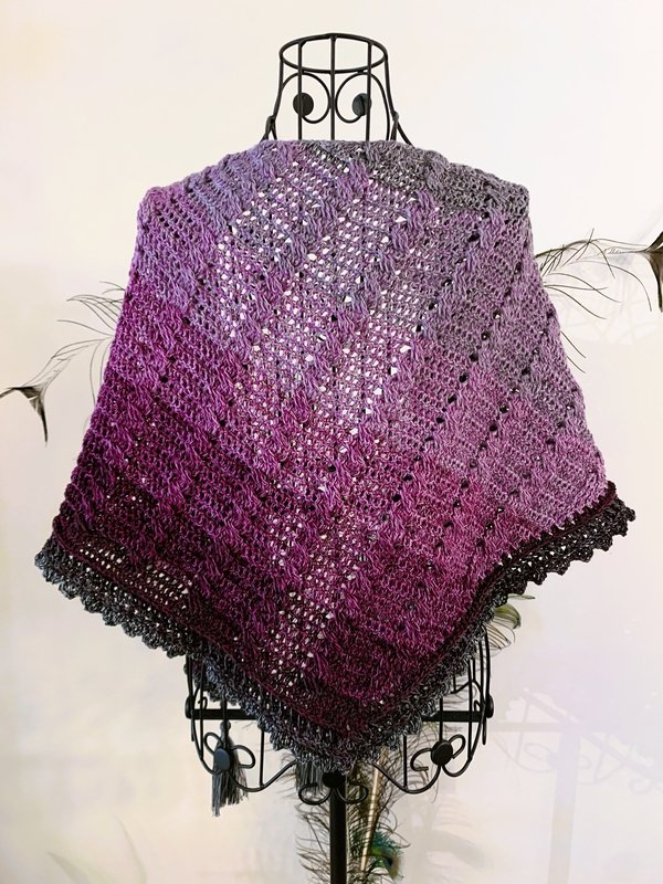 Das Tuch "Dione" ist asymmetrisch gehäkelt, hat ein verspieltes Zopfmuster und als Blickfang einen gewellten Rand und Quasten.