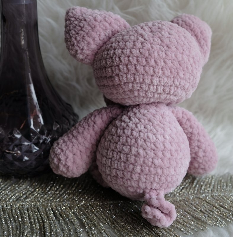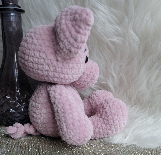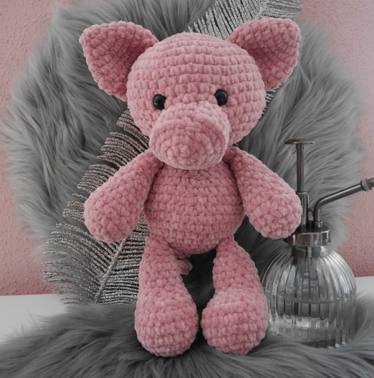 Die Anleitung ist für Chenillewolle und eine Häkelnadel 4,5 mm geschrieben, dann hat das Schweinchen eine Größe von ca. 25 cm. Natürlich kann auch jede andere Wolle verwendet werden – hier ändert sich die Größe entsprechend.