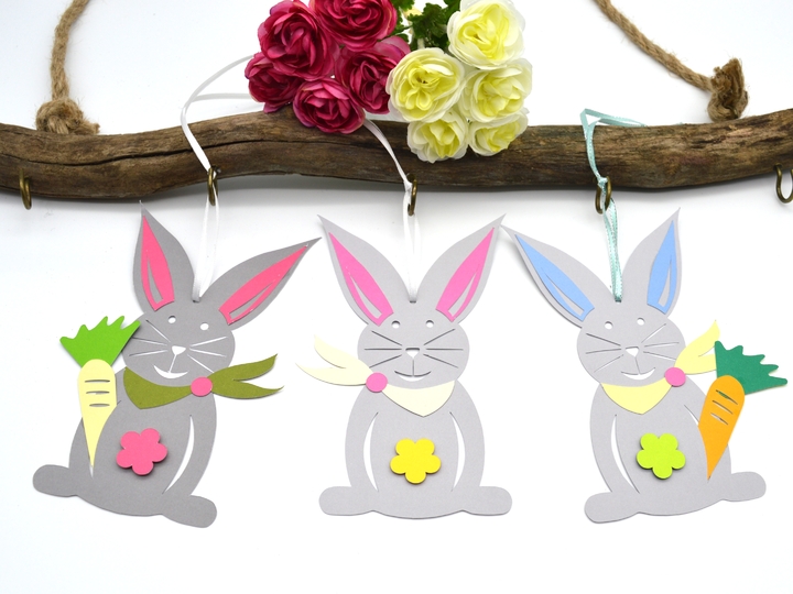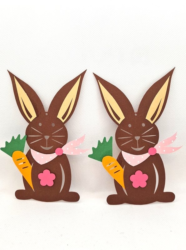 Der Hase ist einmal mit einem Loch zum Aufhängen und einmal ohne Loch enthalten. Ergänzt wird er durch bunte Innenohren oder einer Karotte. Hier kann frei nach eigenen Wünschen kreiert und kobiniert werden.
