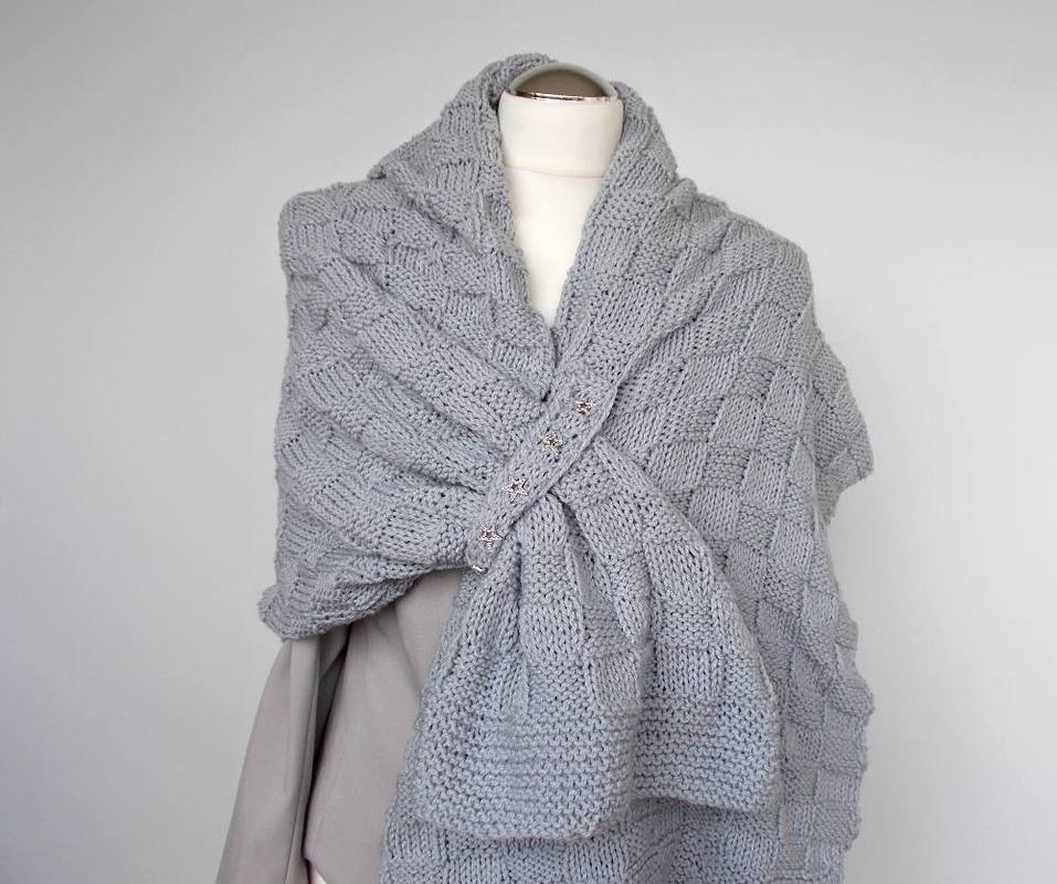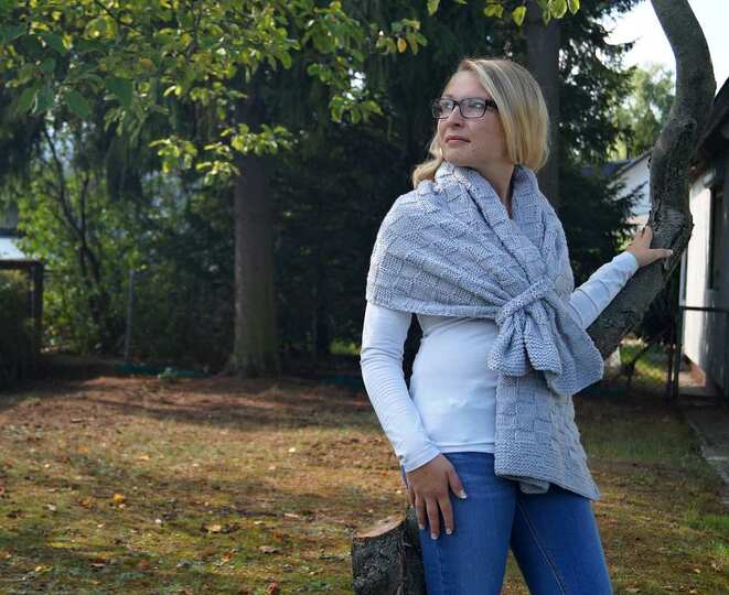 Ein gestrickter Schulterschal im attraktiven Schachbrettmuster mit raffinierter Verschlusslösung.