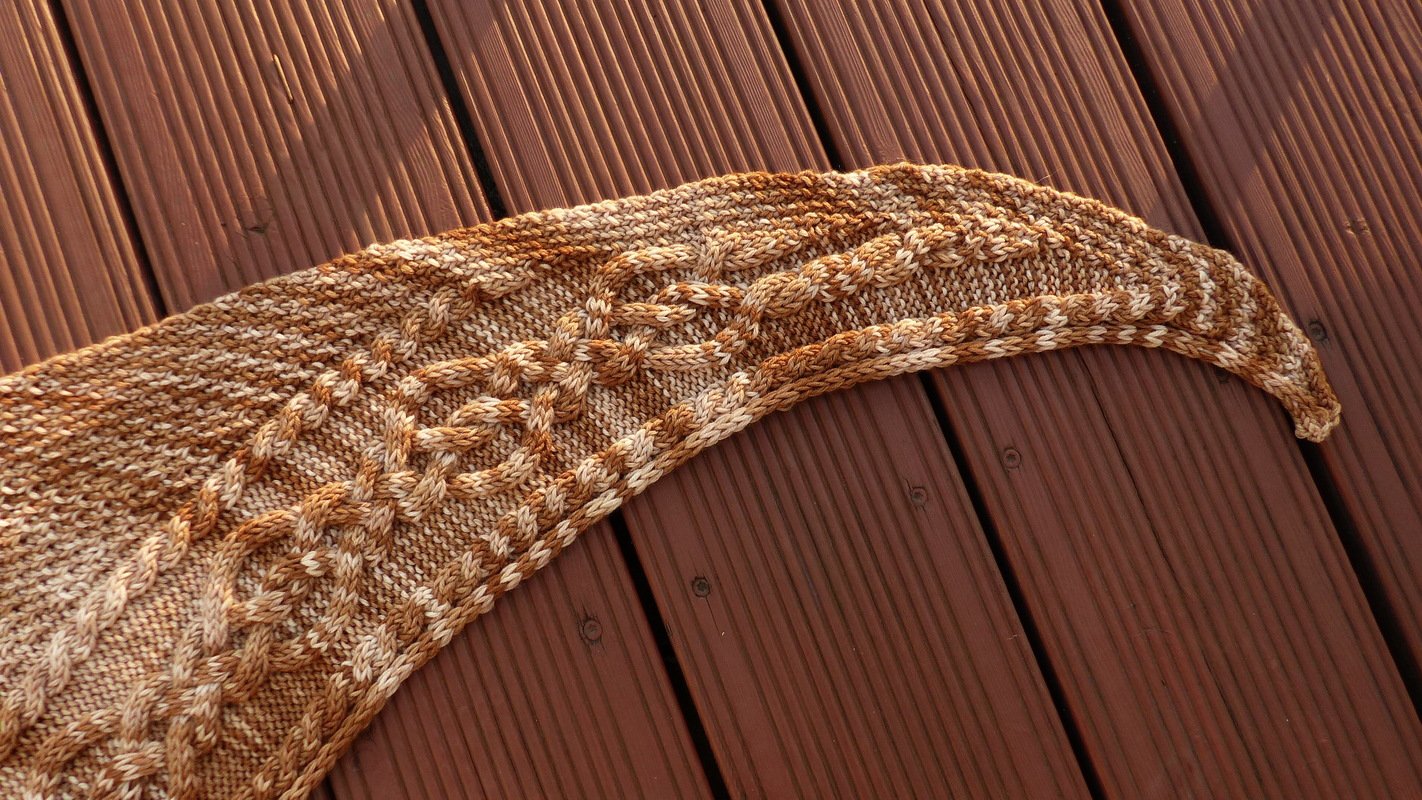Es wird mit Zopfmuster, Perlmuster und i-Cord-Rand gestrickt.