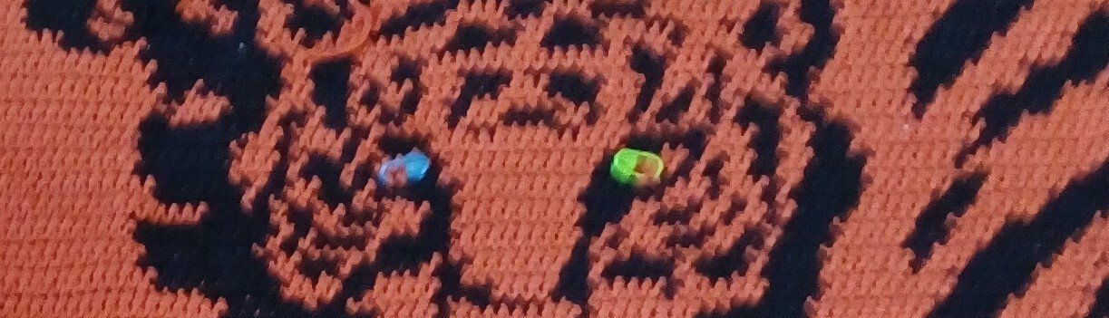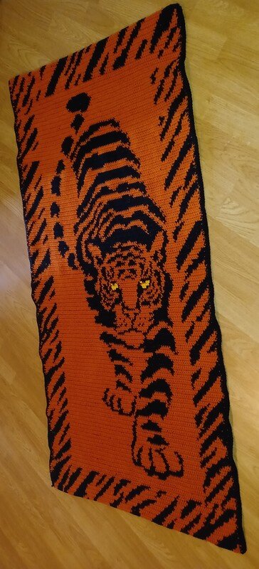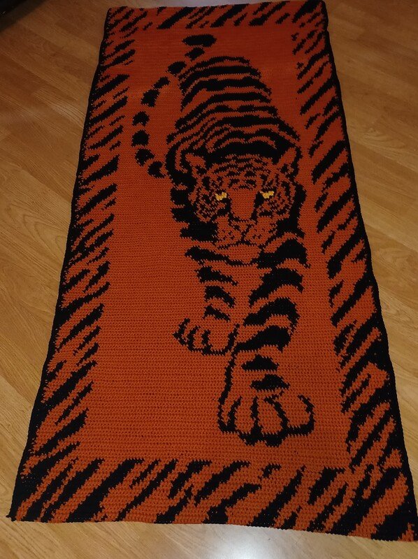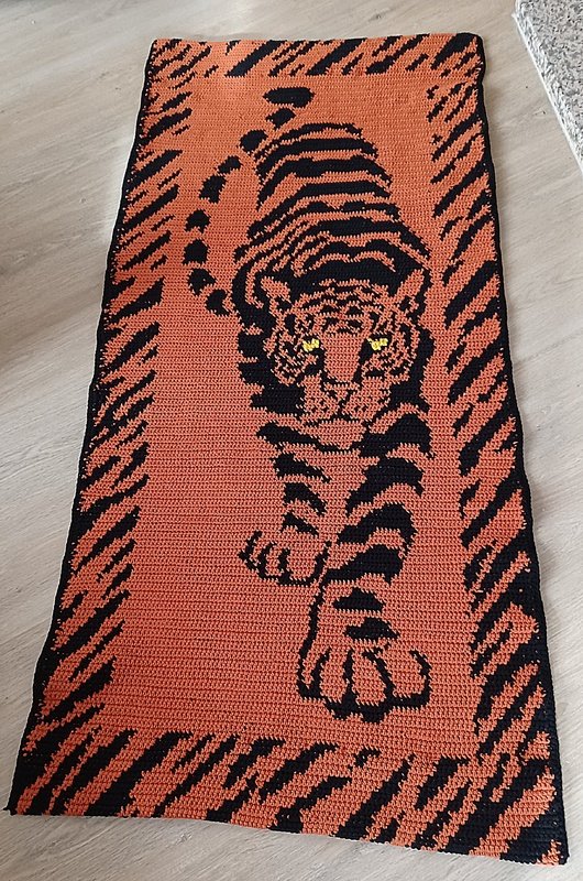 Dieser Teppich mit einer Größe von 75 cm x 150 cm ist eine wahre Fleissarbeit und es macht riesigen Spaß Stück um Stück zu sehen wie der Tiger entsteht. Bestimmt wird er zum Hingucker in deiner Wohnung, sei es als Teppich oder gearbeitet mit dünnerer Wolle als Wandbehang.
