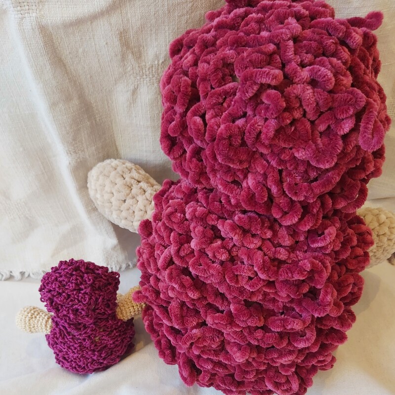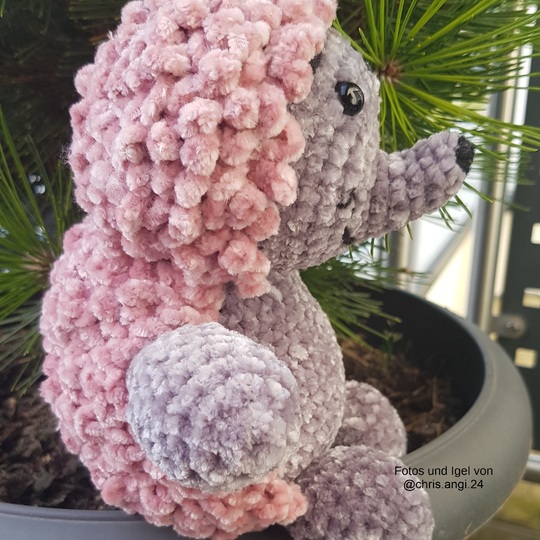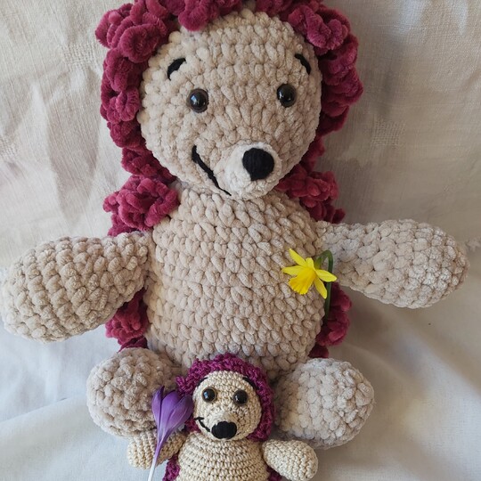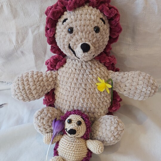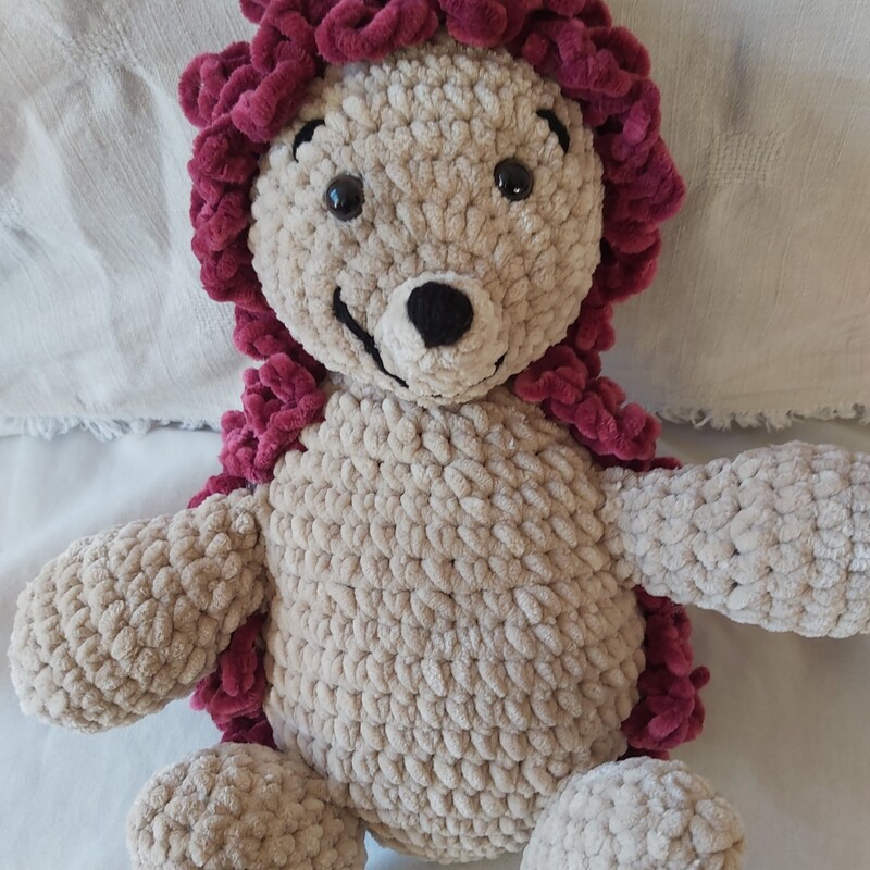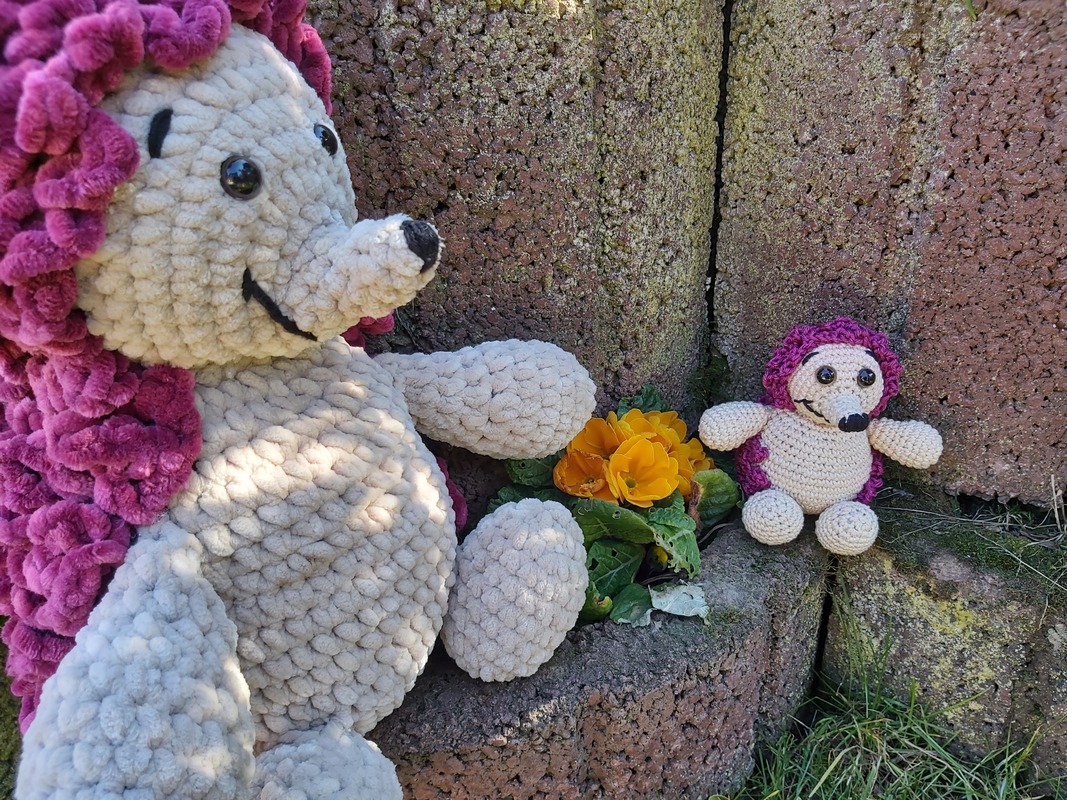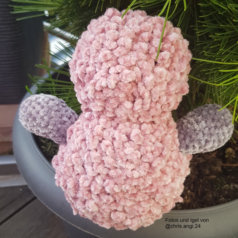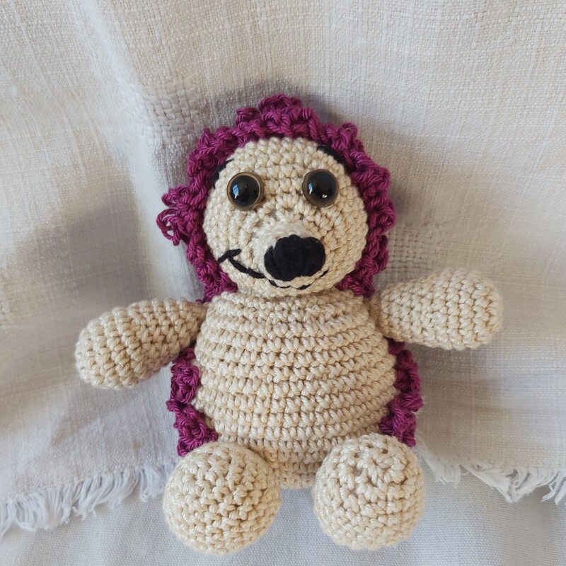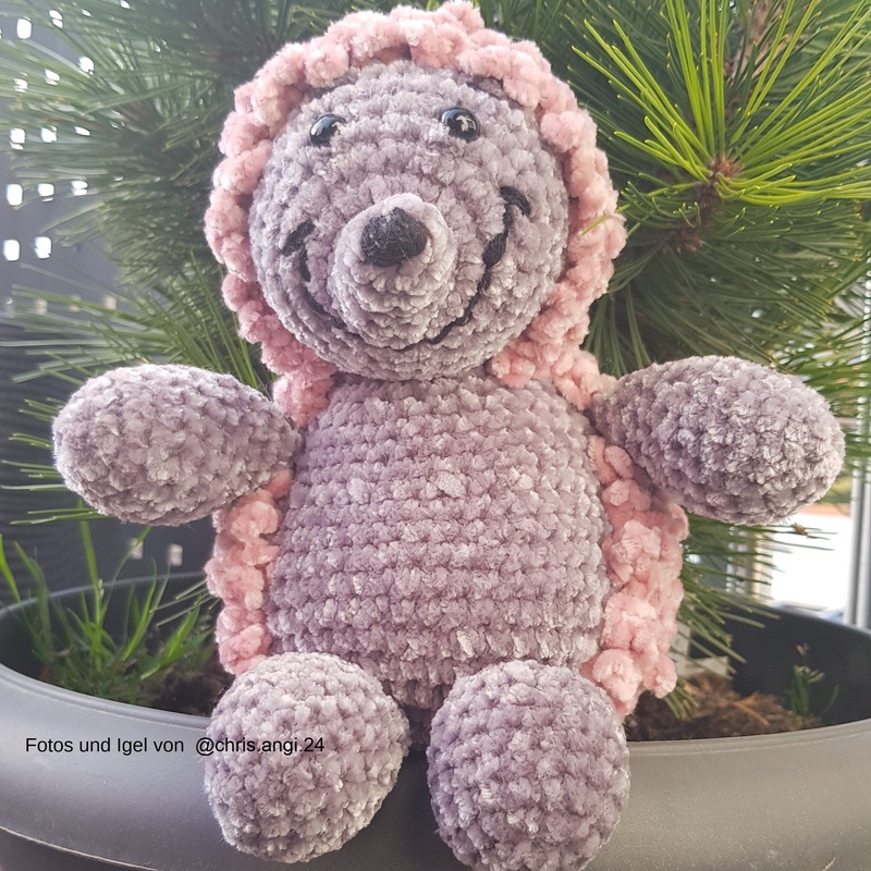Igel Punky hat mit Baumwolle gehäkelt eine Größe von ca. 12 cm. Mit Chenille-Wolle eine Größe von ca. 30 cm.