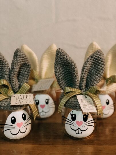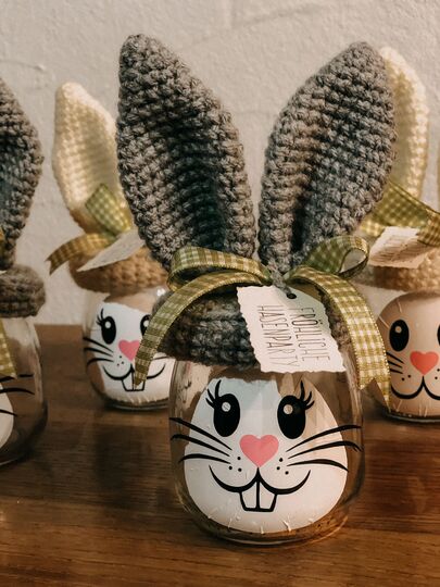 Material: Glas mit Deckel, Wolle, passende Häkelnadel, Heißklebepistole, Nähnadel, Hasengesicht zum Aufkleben oder Wasserfeste Stifte zum Malen, Schleife und Schild.