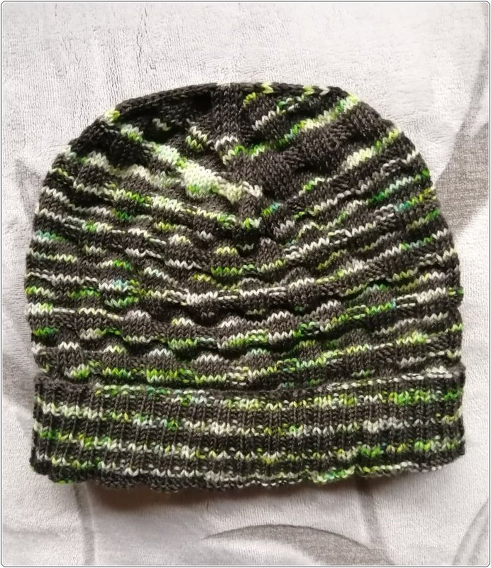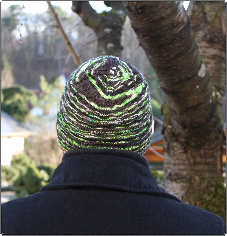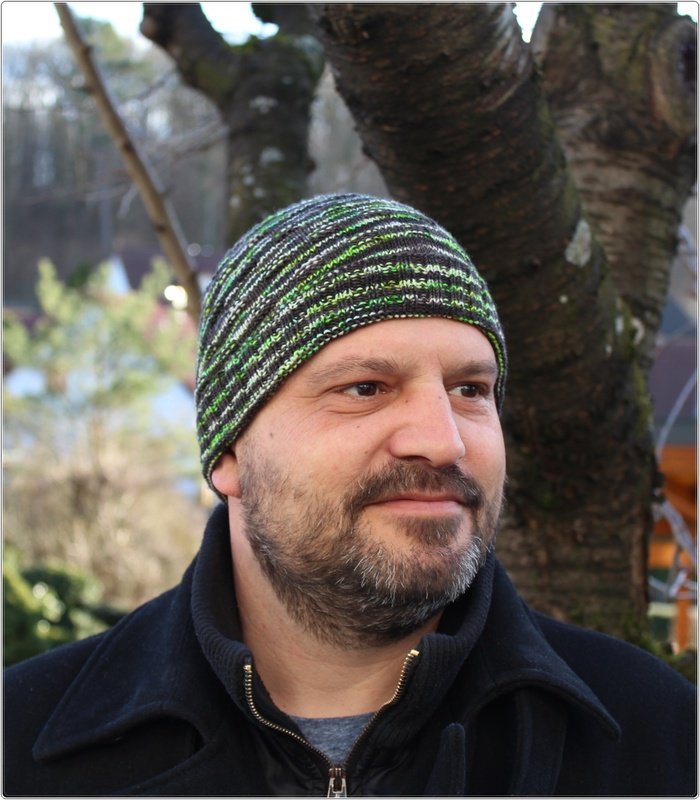 Auch Männer brauchen Mützen um einen warmen Kopf und warme Ohren zu behalten, denn wir wollen ja nicht, dass sie sich erkälten. Nichts ist schlimmer als kranke Männer zu Hause zu haben, das tut ihnen und uns nicht gut. Deshalb hat auch mein geliebter Mann mal wieder ein neues Modell bekommen. Die Färbung „grünes Zebra“ von Helmi´s Farbexplosionen eignet sich super um ein kleines Muster, welches bisschen 3-D-mäßig aussieht, einzuarbeiten. Da ich von 100 Gramm lediglich 55 Gramm verbraucht habe, habe ich sie gleich nochmal in kleiner Ausführung für unser süßes Enkelkind gestrickt. Nun können die beiden im Partnerlook rausgehen.